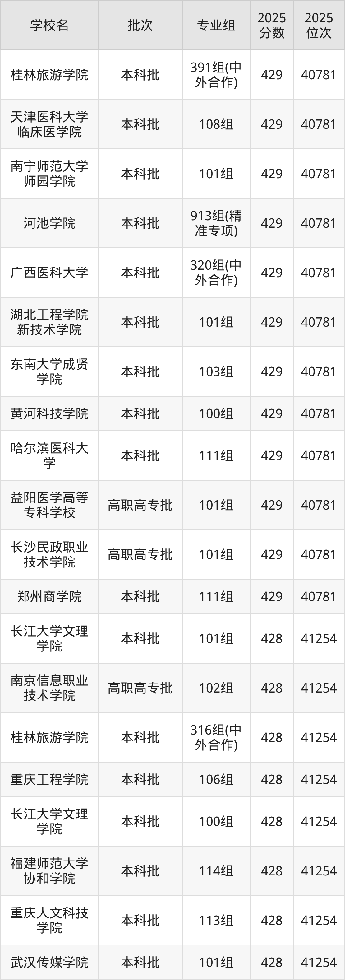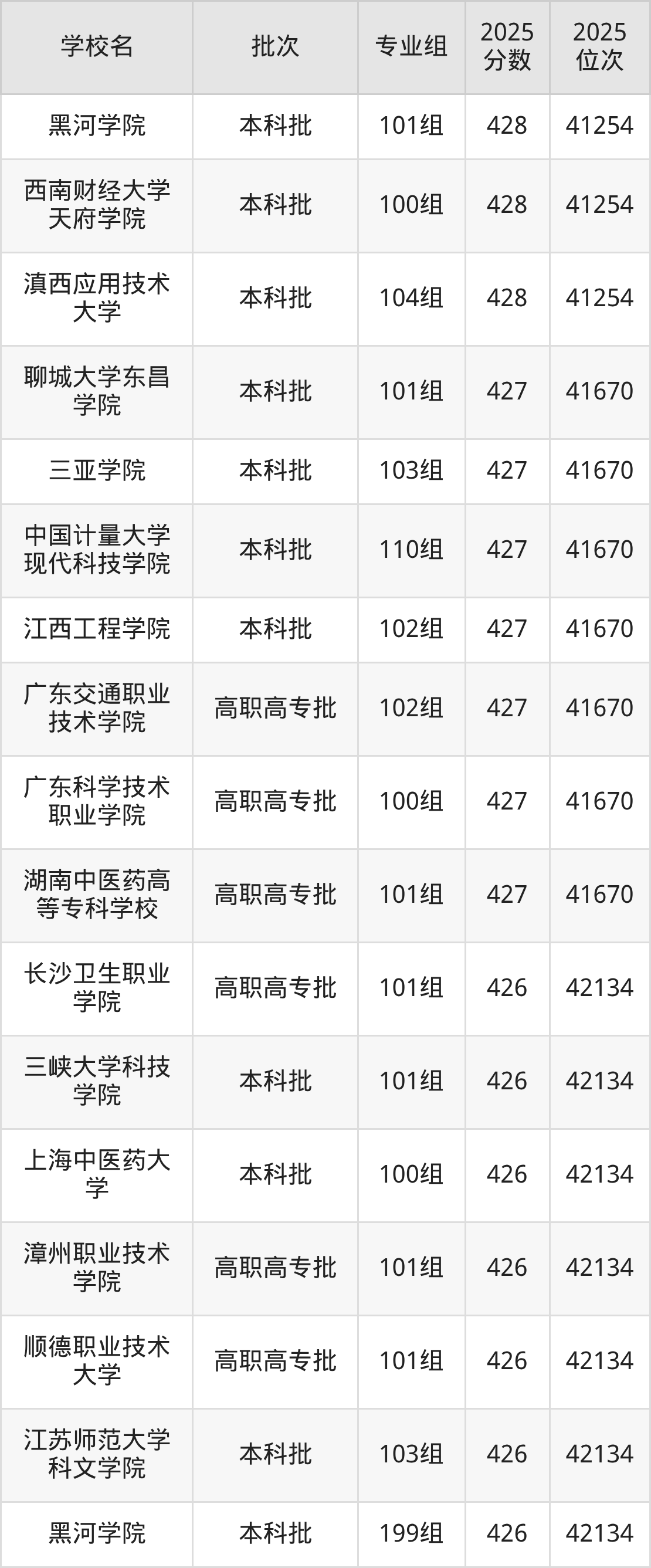 2025年广西高考历史类427分(41255名~41670名)能上的大学有江西工程学院102组、中国计量大学现代科技学院110组、三亚学院103组、聊城大学东昌学院101组等。