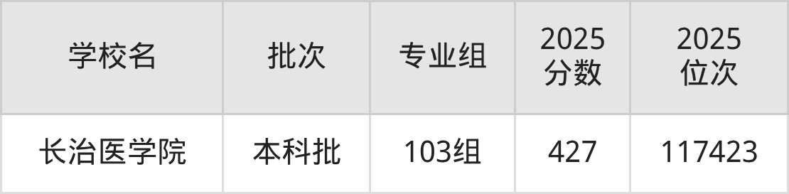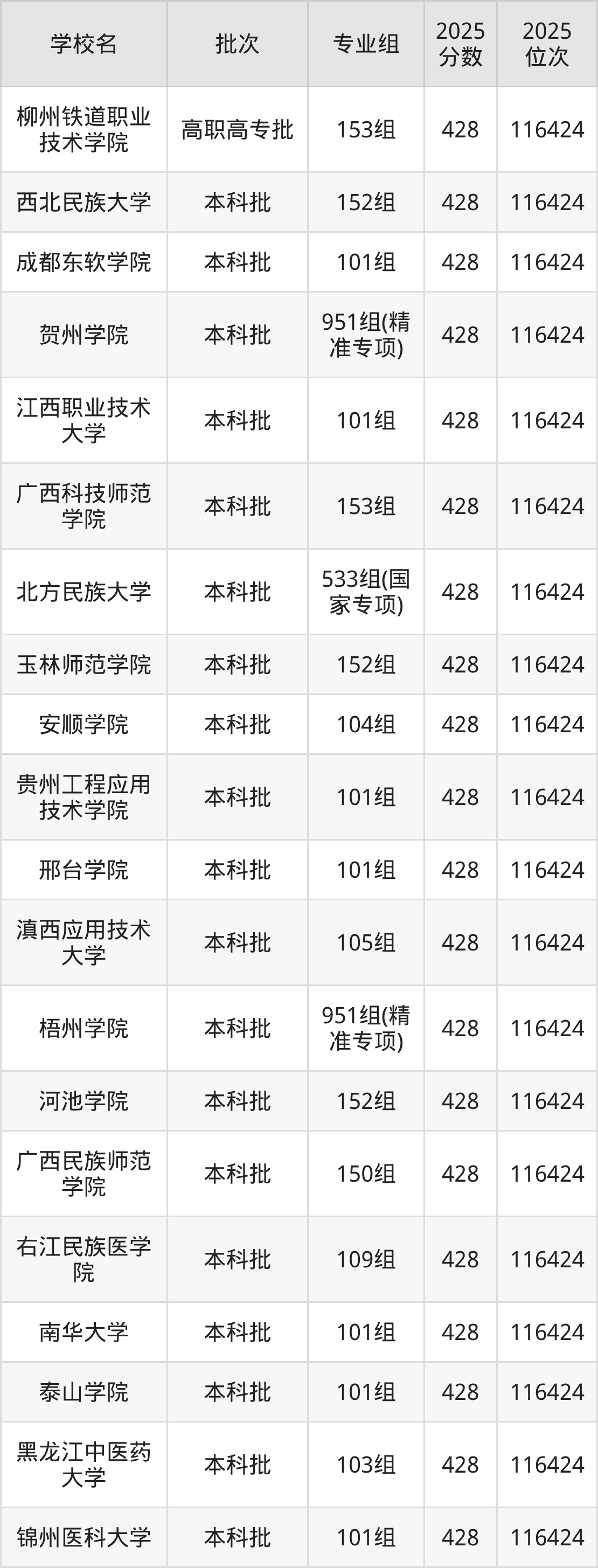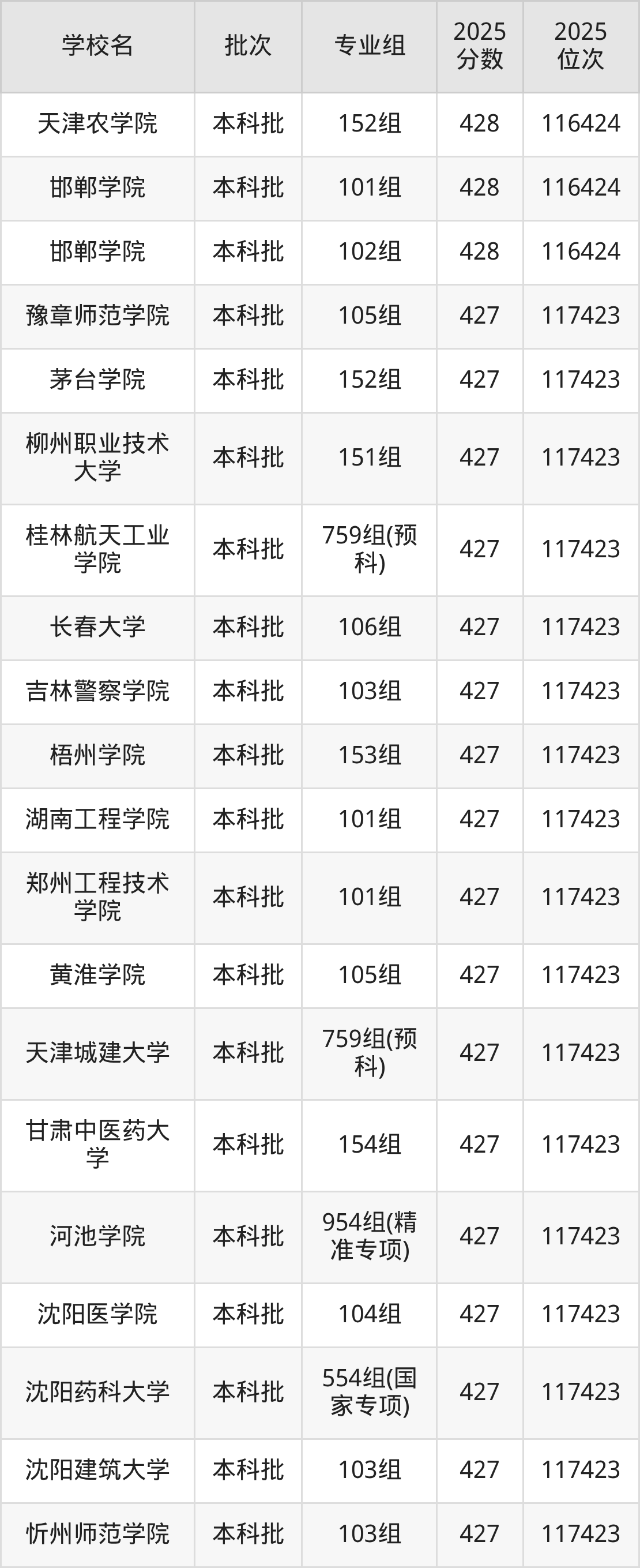 2025年广西高考物理类427分(116425名~117423名)能上的大学有长治医学院103组、忻州师范学院103组、沈阳建筑大学103组、沈阳药科大学554组(国家专项)等。