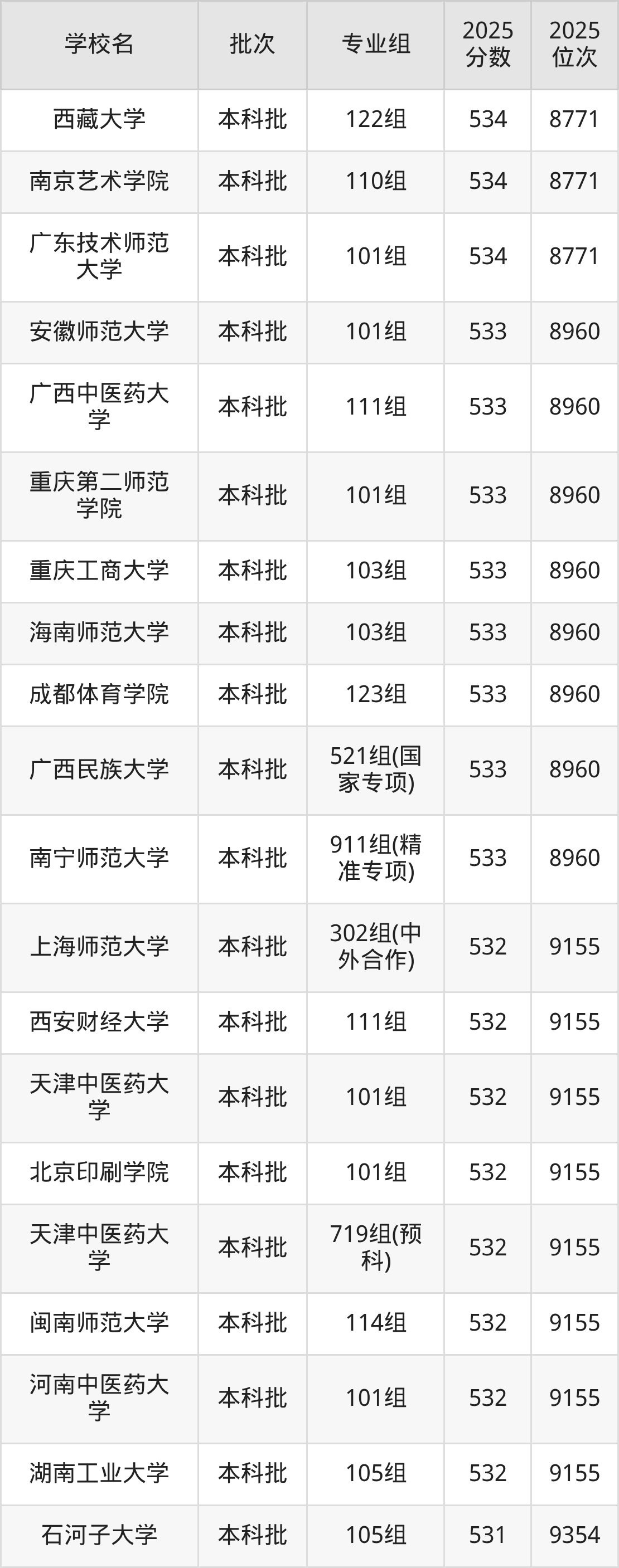2025年广西高考历史类533分(8772名~8960名)能上的大学有安徽师范大学101组、广西中医药大学111组、南宁师范大学911组(精准专项)、广西民族大学521组(国家专项)等。