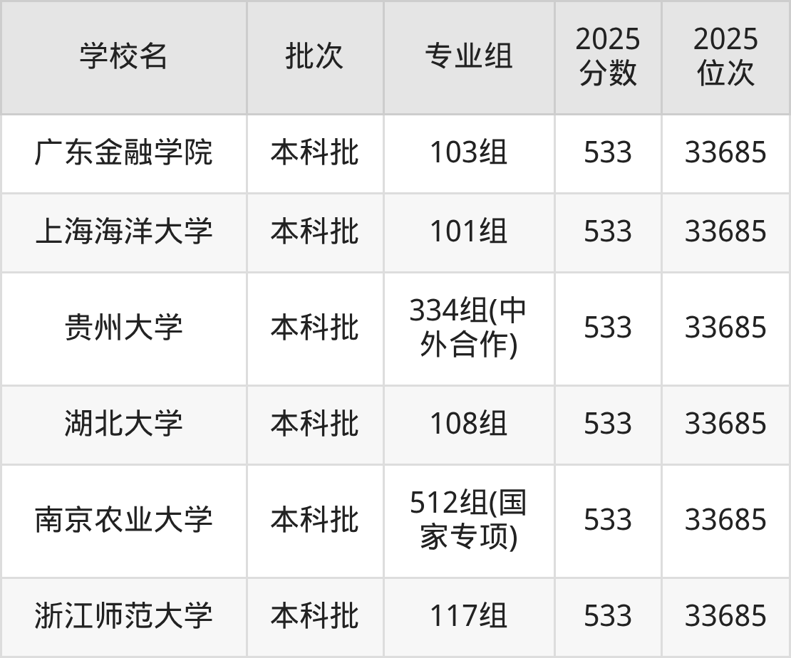 这些都是2026年高考物理类33125名~33685名考生可以报考的大学,更多学校名单如下表所示: