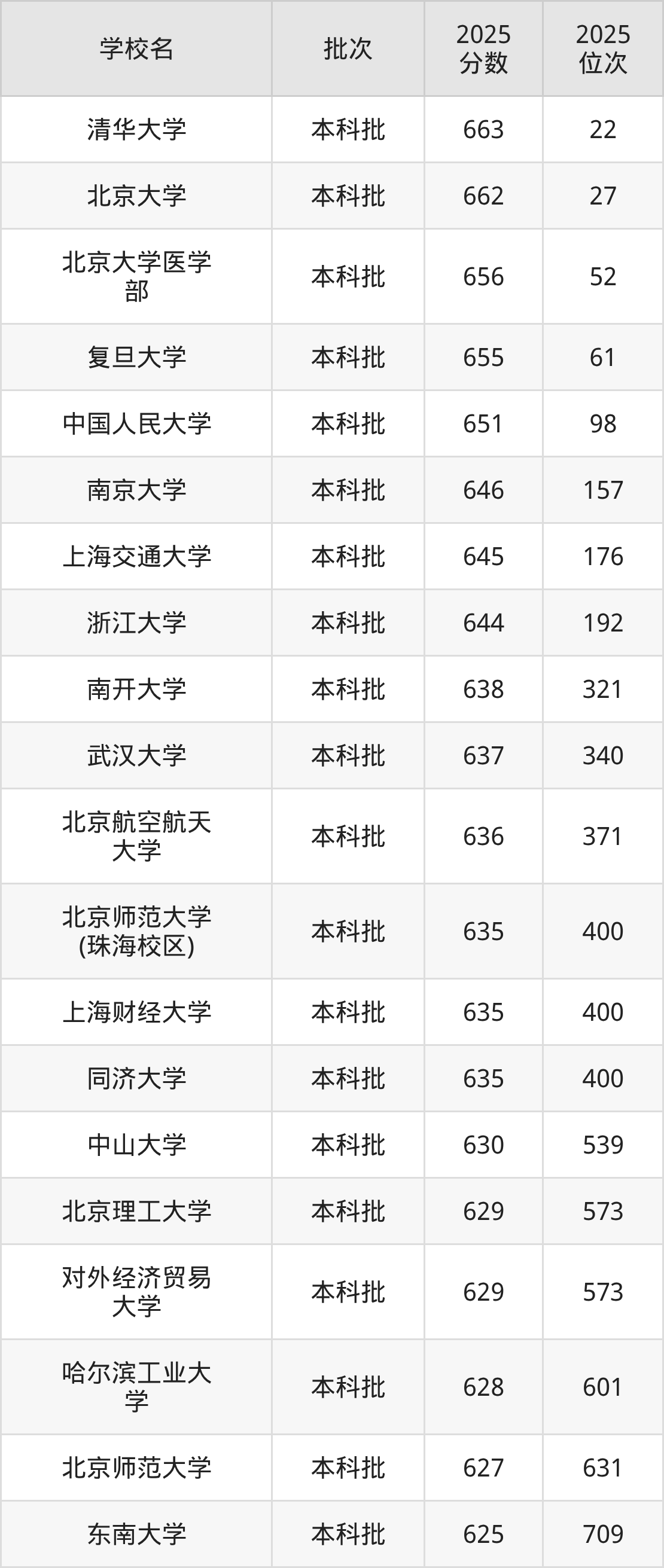 2025年辽宁高考历史类639分(263名~291名)录取位次低于该区间(较稳妥)的有南开大学(321名)、武汉大学(340名)等;录取位次高于该区间(可冲)的有浙江大学(192名)、上海交通大学(176名)等。