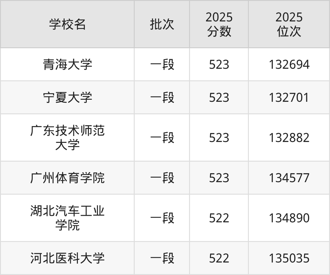 2025年山东高考523分(132391名~134596名)能上的大学有广州体育学院、广东技术师范大学、青海大学、宁夏大学。
