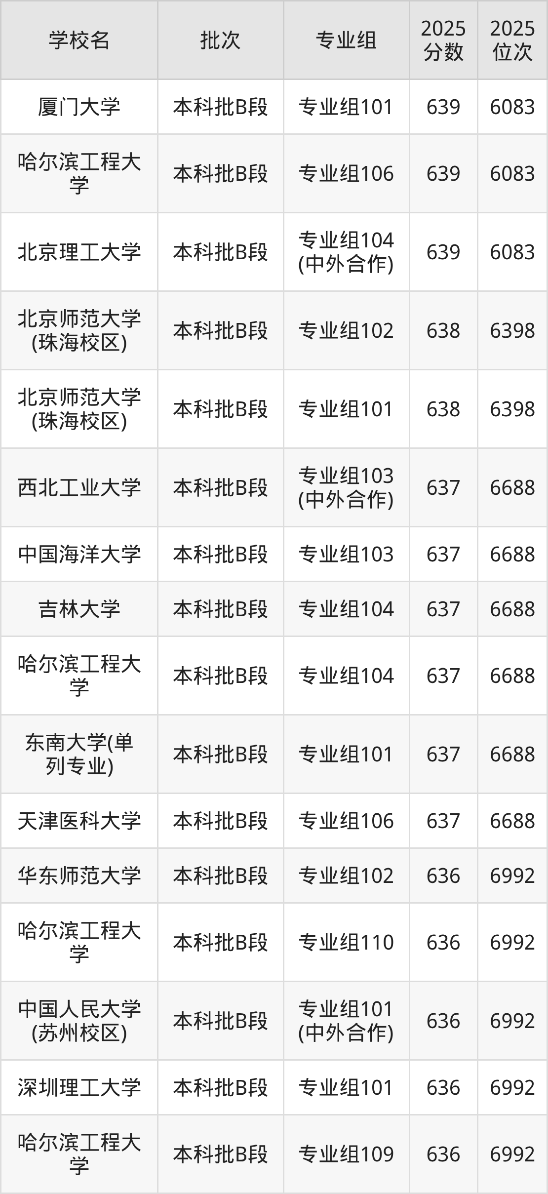 2025年四川高考物理类637分(6399名~6688名)能上的大学有中国海洋大学专业组103、天津医科大学专业组106、东南大学(单列专业)专业组101、西北工业大学专业组103(中外合作)等。