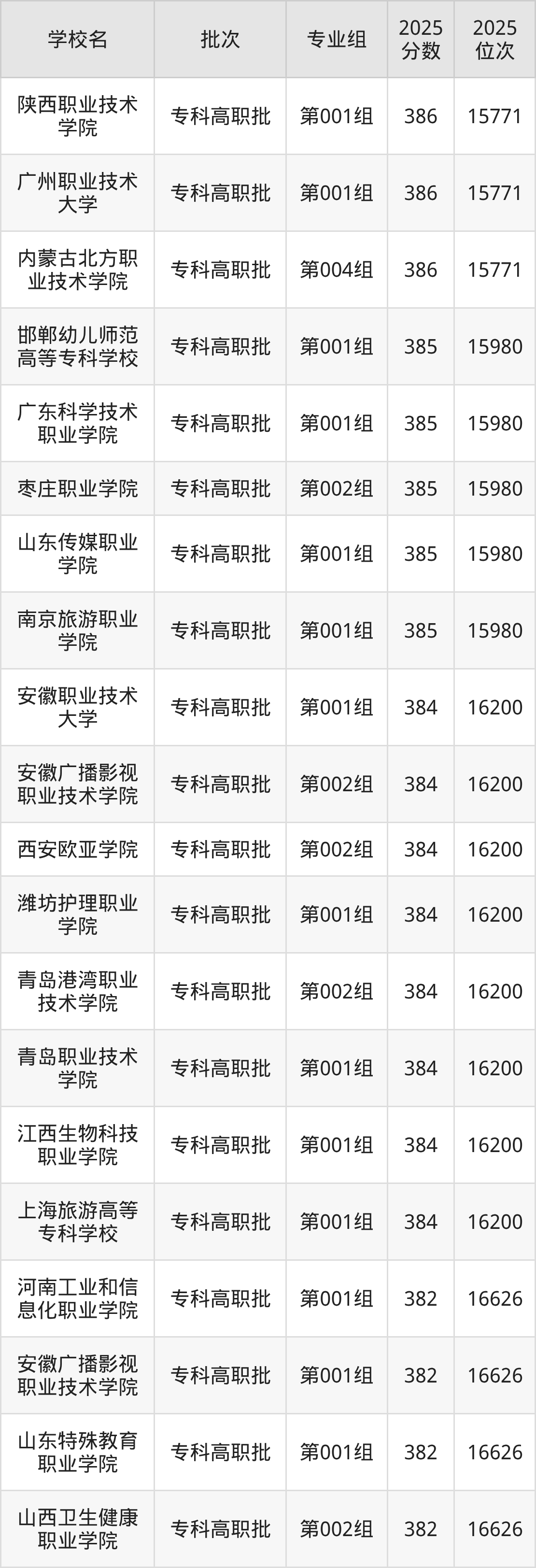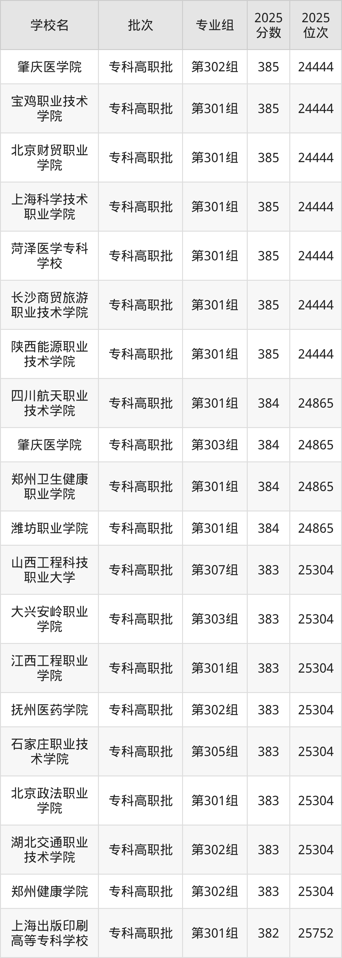 2025年山西高考物理类383分(24866名~25304名)能上的大学有北京政法职业学院第301组、石家庄职业技术学院第305组、大兴安岭职业学院第303组、抚州医药学院第302组等。
