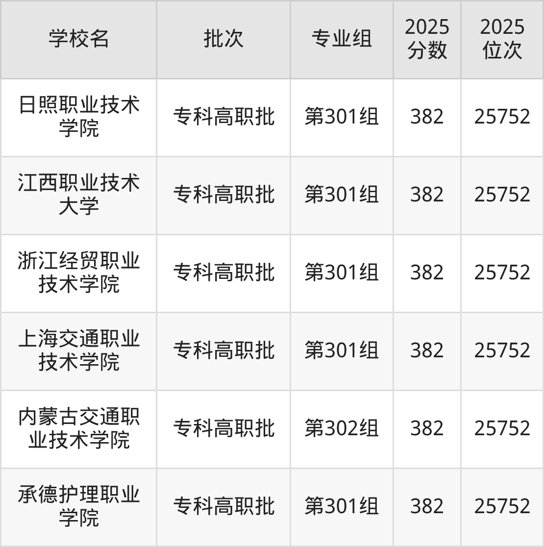 2025年山西高考历史类383分(16201名~16421名)录取位次低于该区间(较稳妥)的有山西卫生健康职业学院第002组(16626名)、安徽广播影视职业技术学院第001组(16626名)等;录取位次高于该区间(可冲)的有西北大学现代学院第001组(35877名)、山东现代学院第001组(35877名)等。