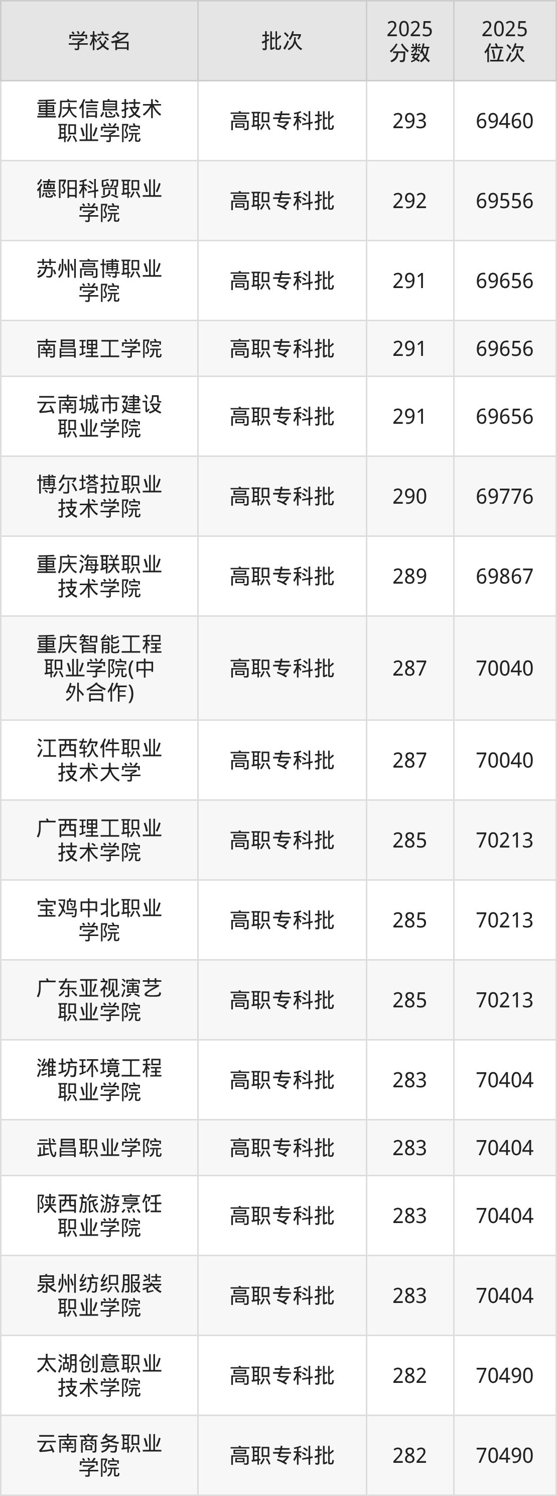 2025年重庆高考历史类287分(69943名~70040名)能上的大学有江西软件职业技术大学、重庆智能工程职业学院(中外合作)。