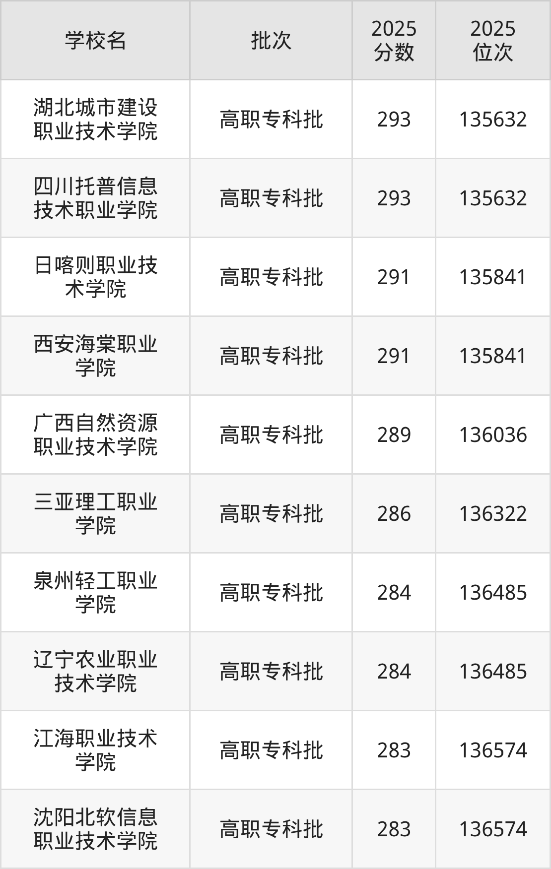2025年重庆高考物理类287分(136121名~136215名)录取位次低于该区间(较稳妥)的有三亚理工职业学院(136322名)、辽宁农业职业技术学院(136485名)等;录取位次高于该区间(可冲)的有广西自然资源职业技术学院(136036名)、日喀则职业技术学院(135841名)等。