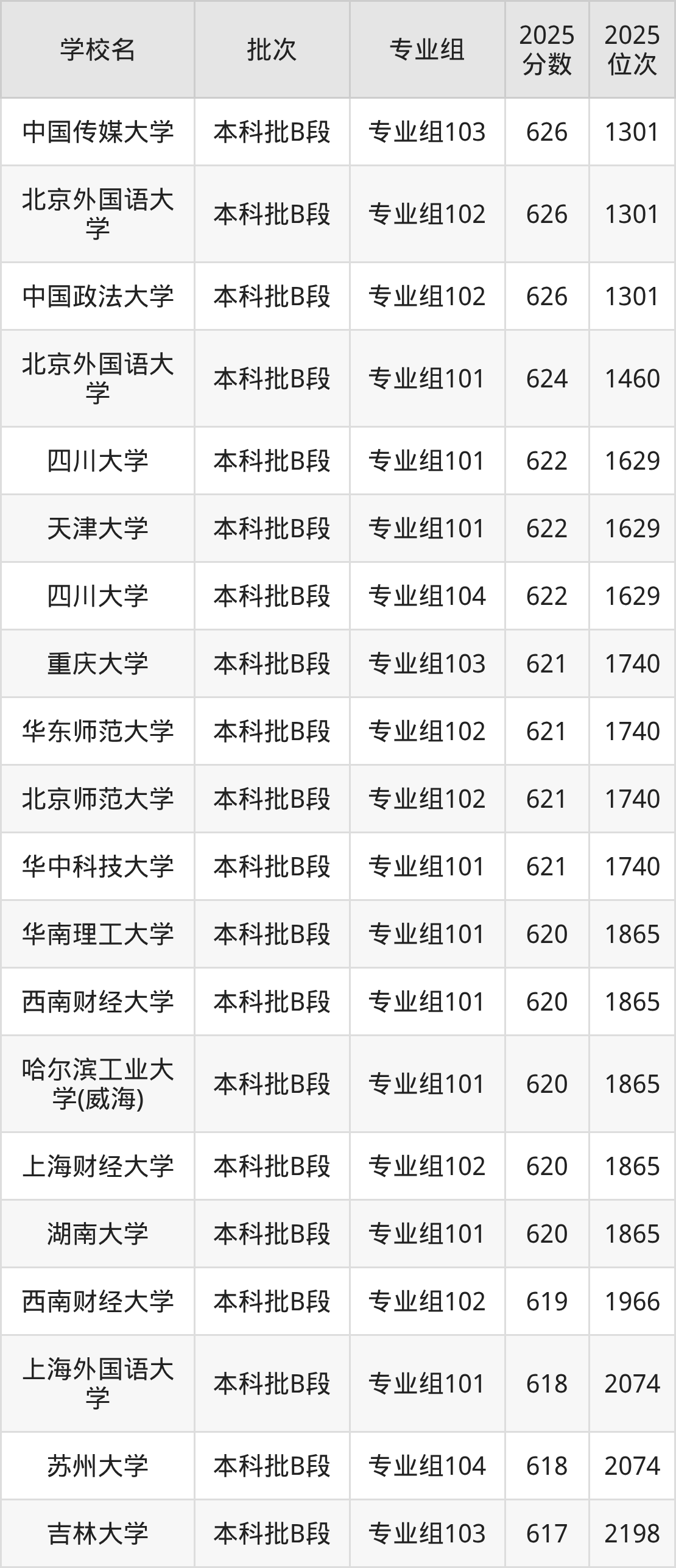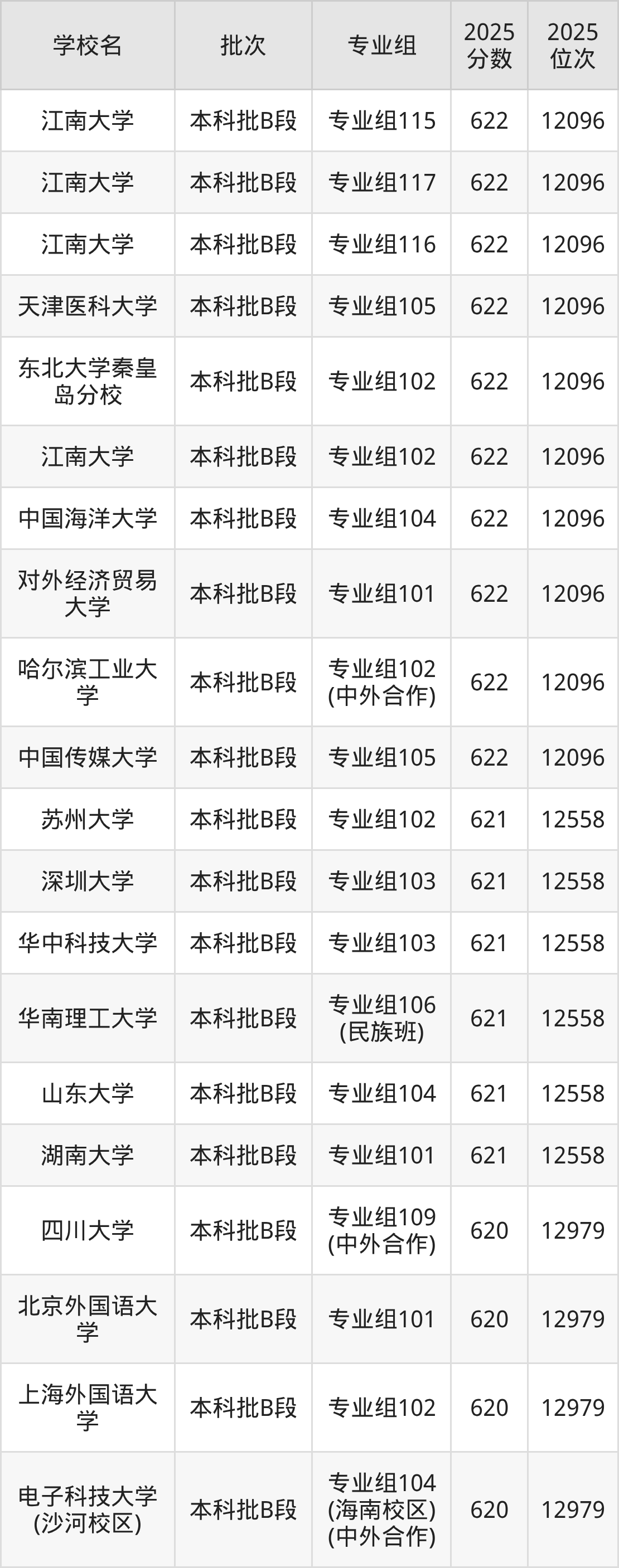 2025年四川高考历史类620分(1741名~1865名)能上的大学有湖南大学专业组101、哈尔滨工业大学(威海)专业组101、西南财经大学专业组101、上海财经大学专业组102等。