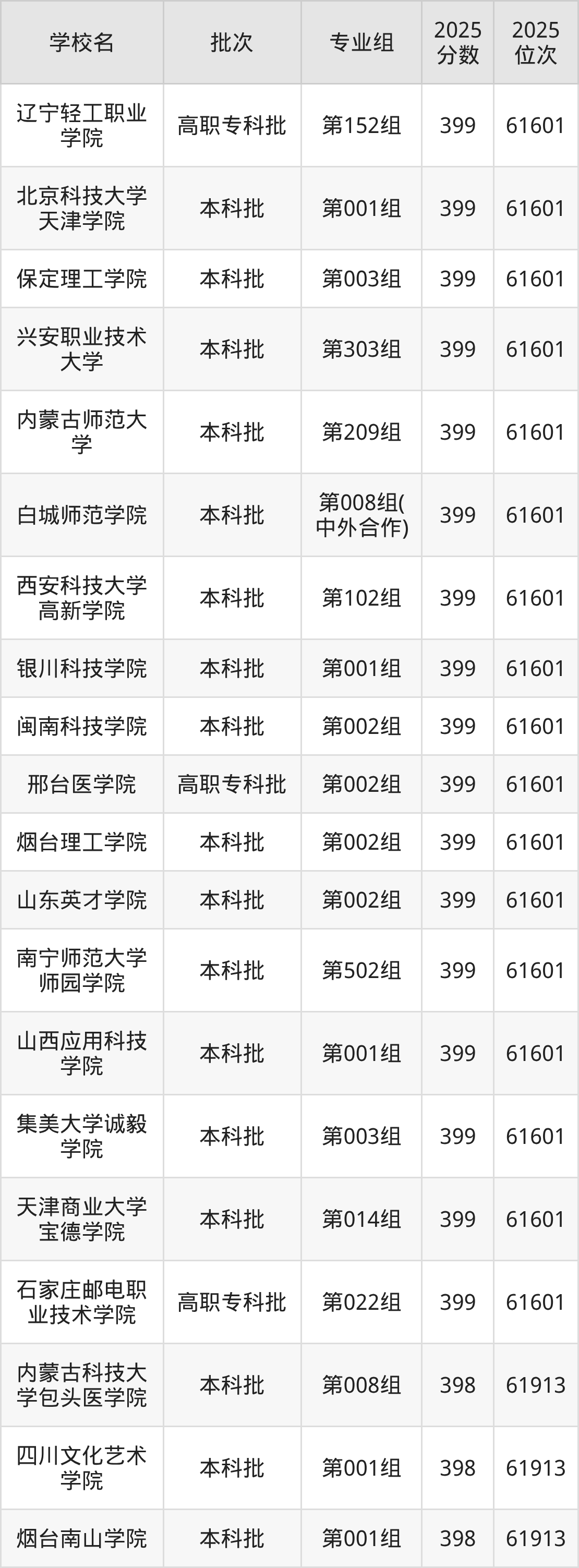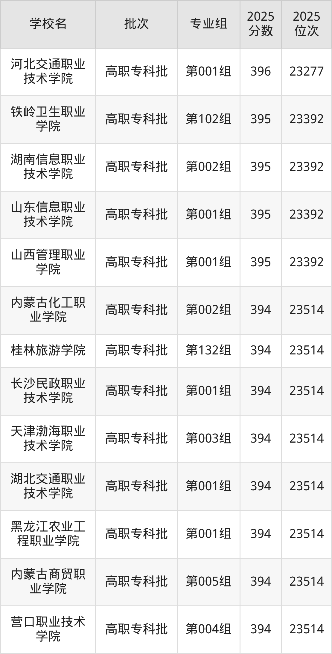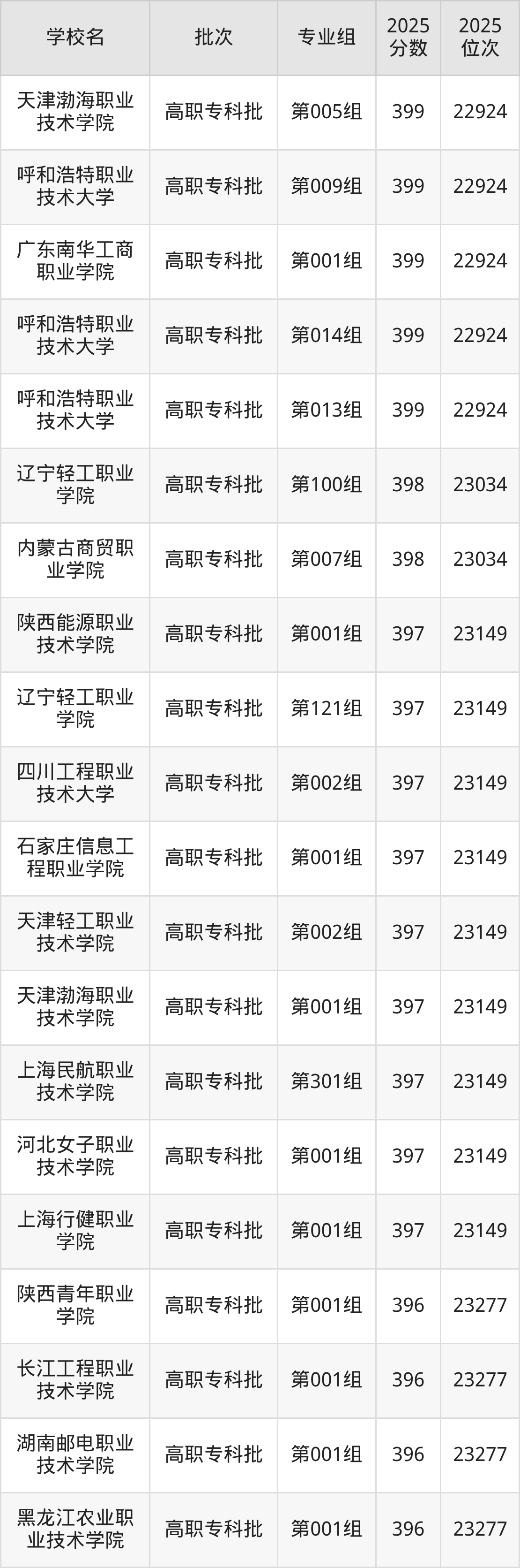 2025年内蒙古高考历史类397分(23035名~23149名)能上的大学有辽宁轻工职业学院第121组、四川工程职业技术大学第002组、天津渤海职业技术学院第001组、河北女子职业技术学院第001组等。