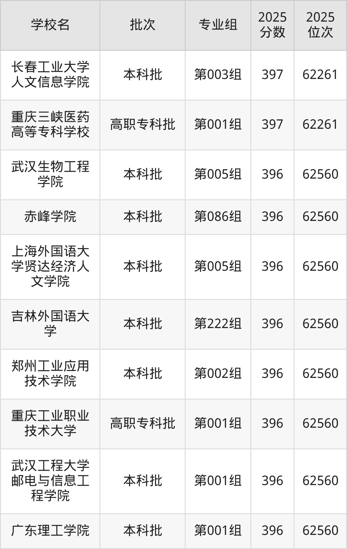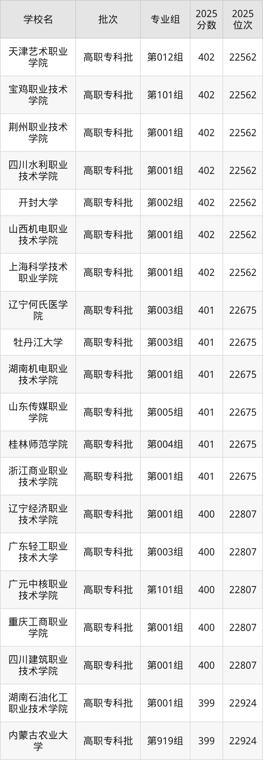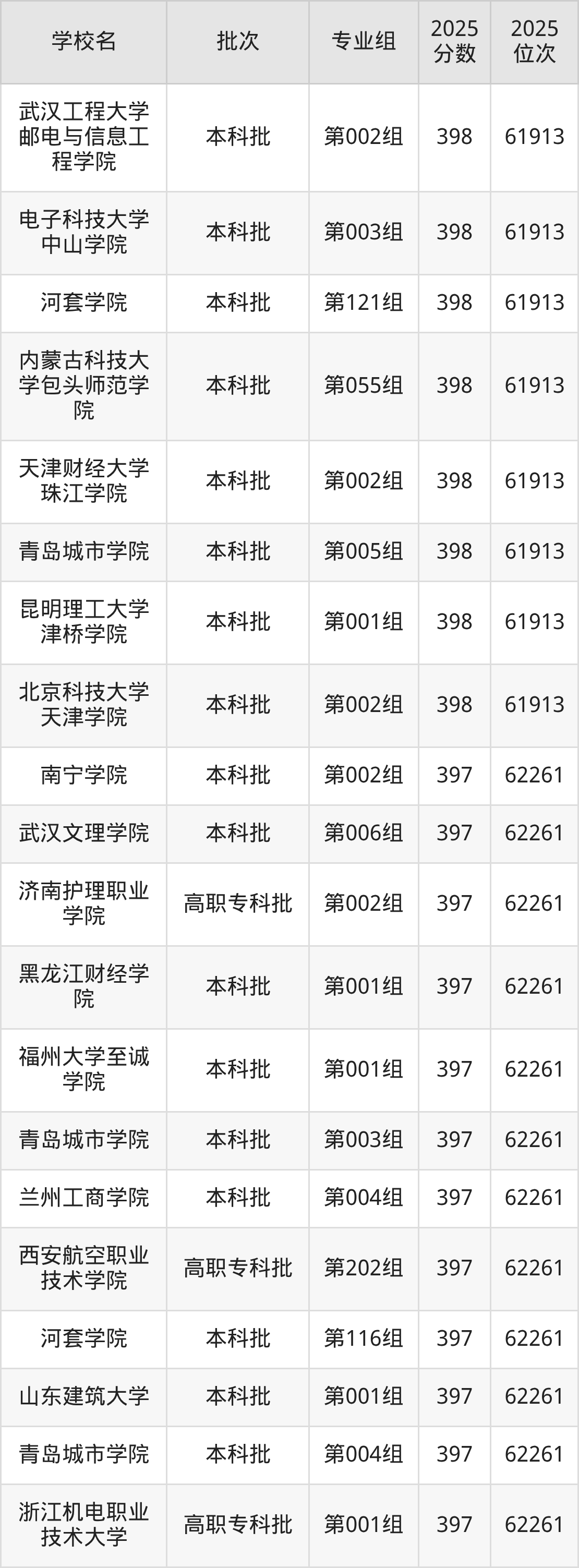 2025年内蒙古高考历史类397分(23035名~23149名)能上的大学有辽宁轻工职业学院第121组、四川工程职业技术大学第002组、天津渤海职业技术学院第001组、河北女子职业技术学院第001组等。