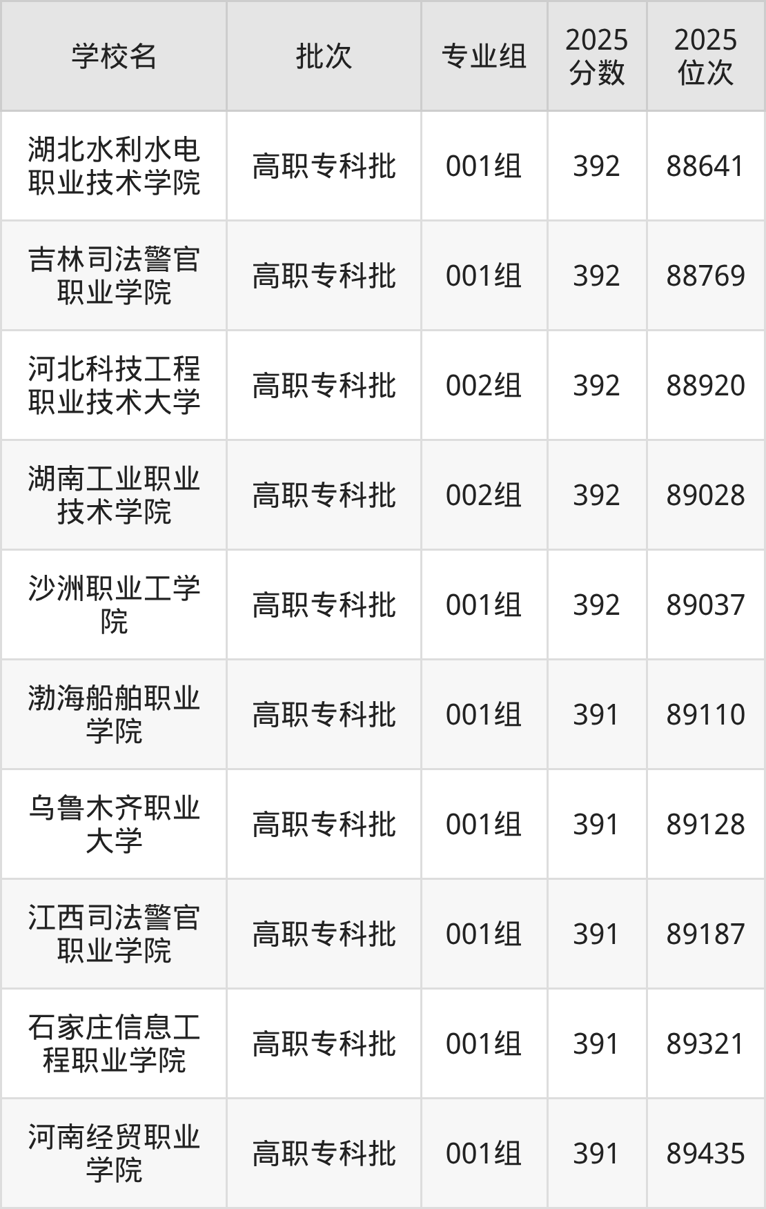 2025年安徽高考历史类391分(89093名~89610名)能上的大学有渤海船舶职业学院001组、河南经贸职业学院001组、江西司法警官职业学院001组、石家庄信息工程职业学院001组等。