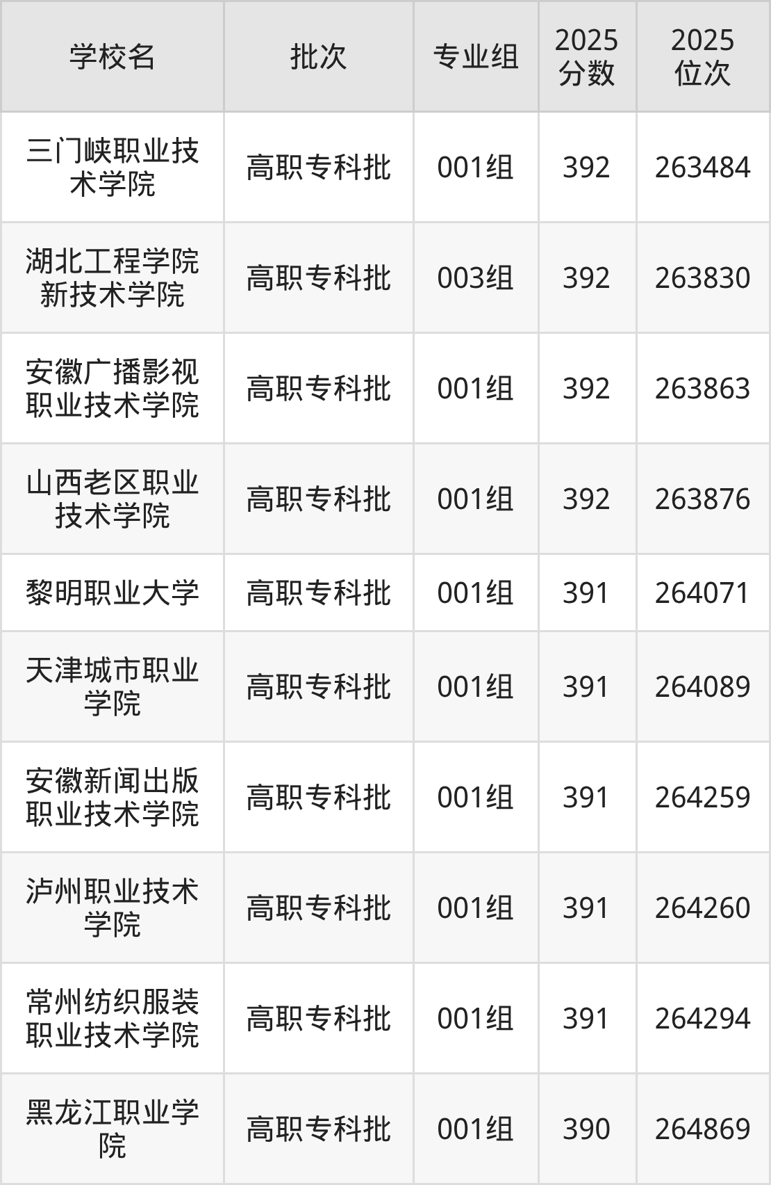2025年安徽高考物理类391分(263920名~264686名)能上的大学有常州纺织服装职业技术学院001组、黎明职业大学001组、泸州职业技术学院001组、天津城市职业学院001组等。