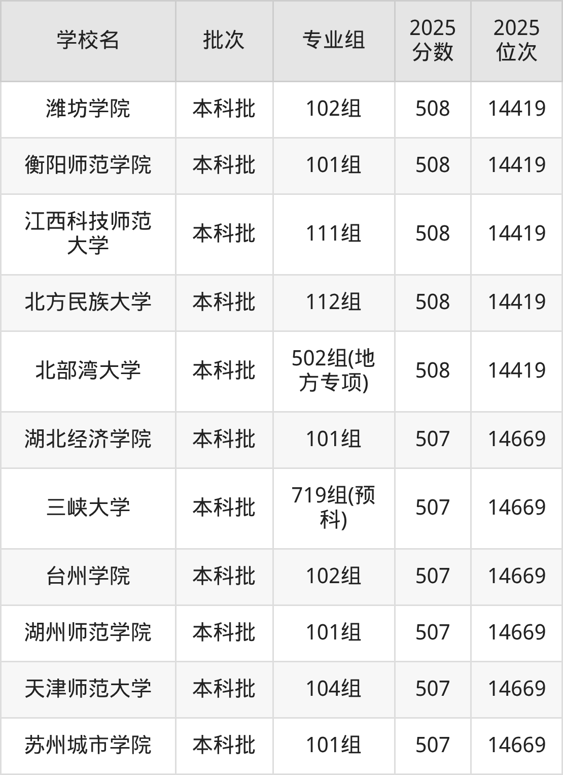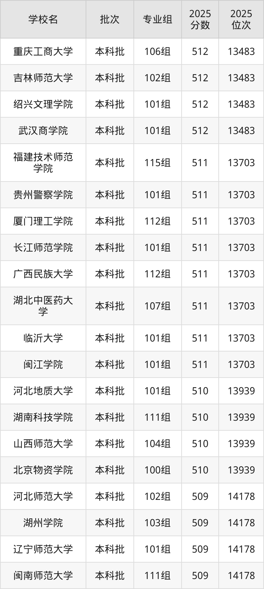 2025年广西高考历史类509分(13940名~14178名)能上的大学有河北师范大学102组、辽宁师范大学101组、闽南师范大学111组、湖州学院103组。