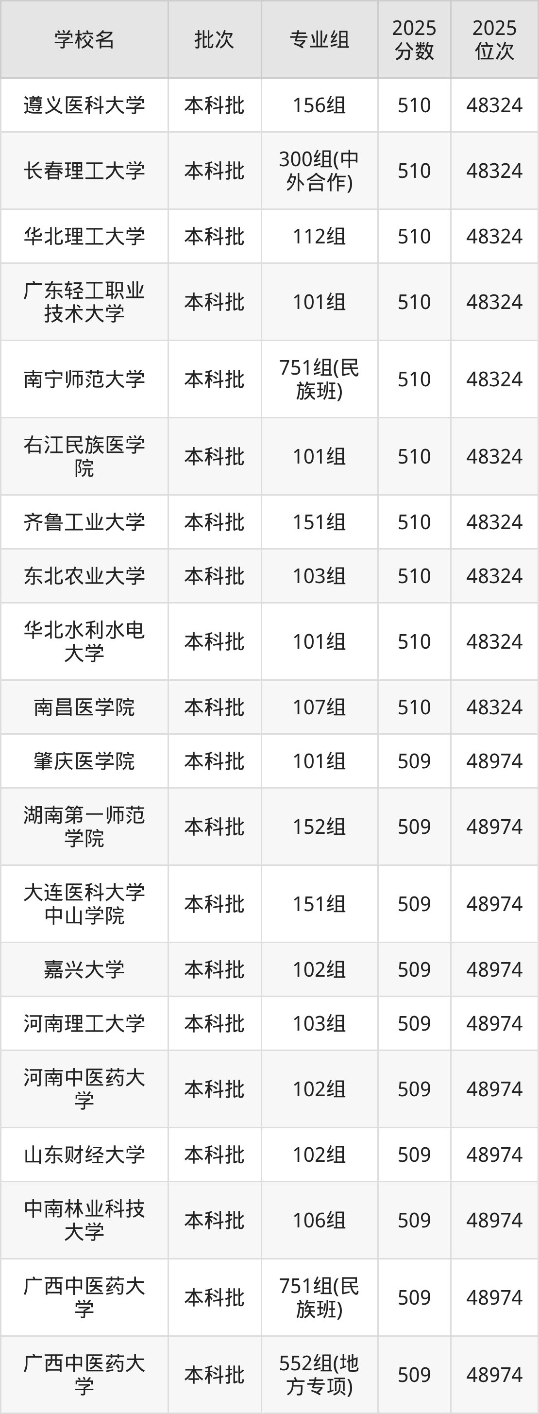 2025年广西高考物理类509分(48325名~48974名)能上的大学有嘉兴大学102组、山东财经大学102组、河南理工大学103组、河南中医药大学102组等。