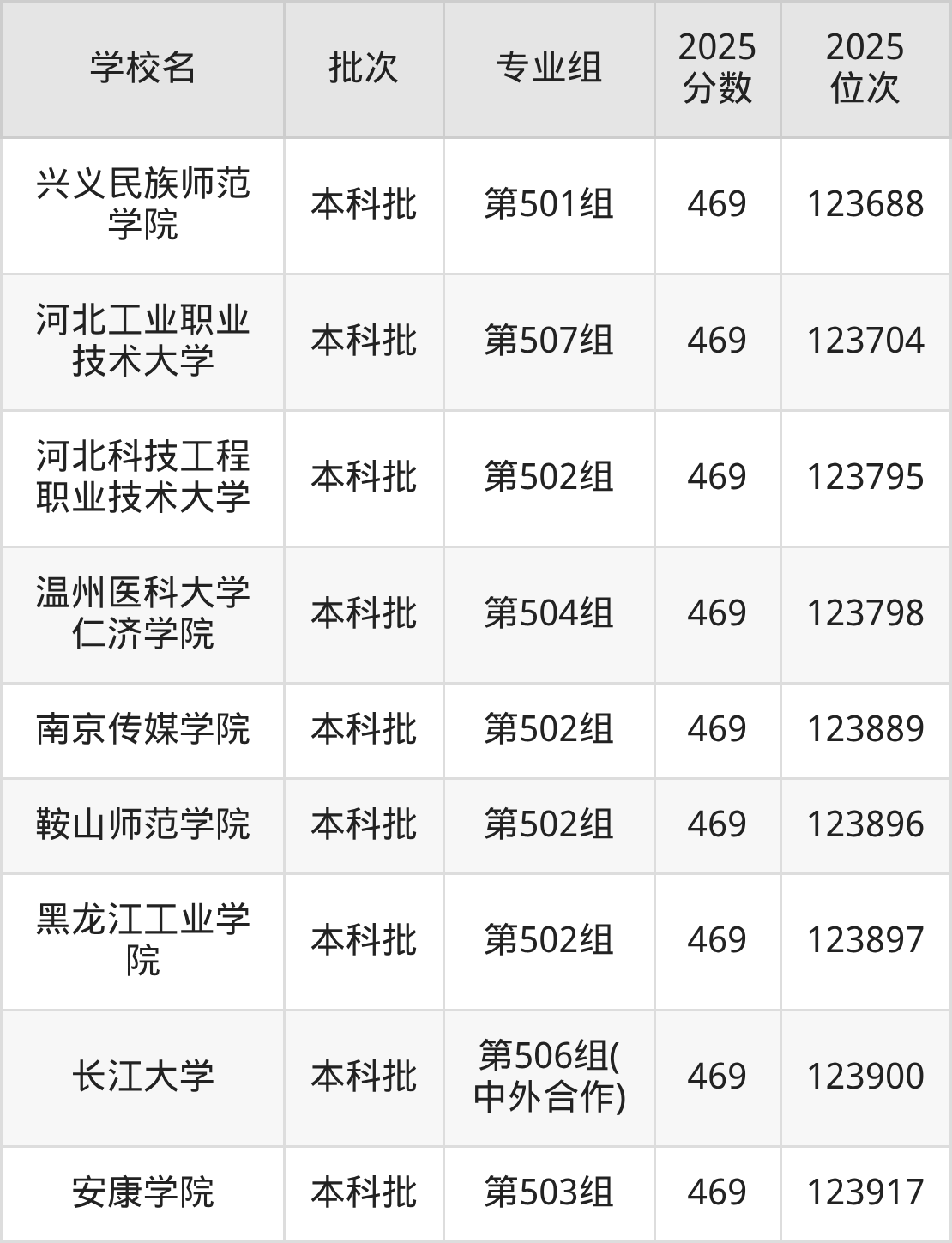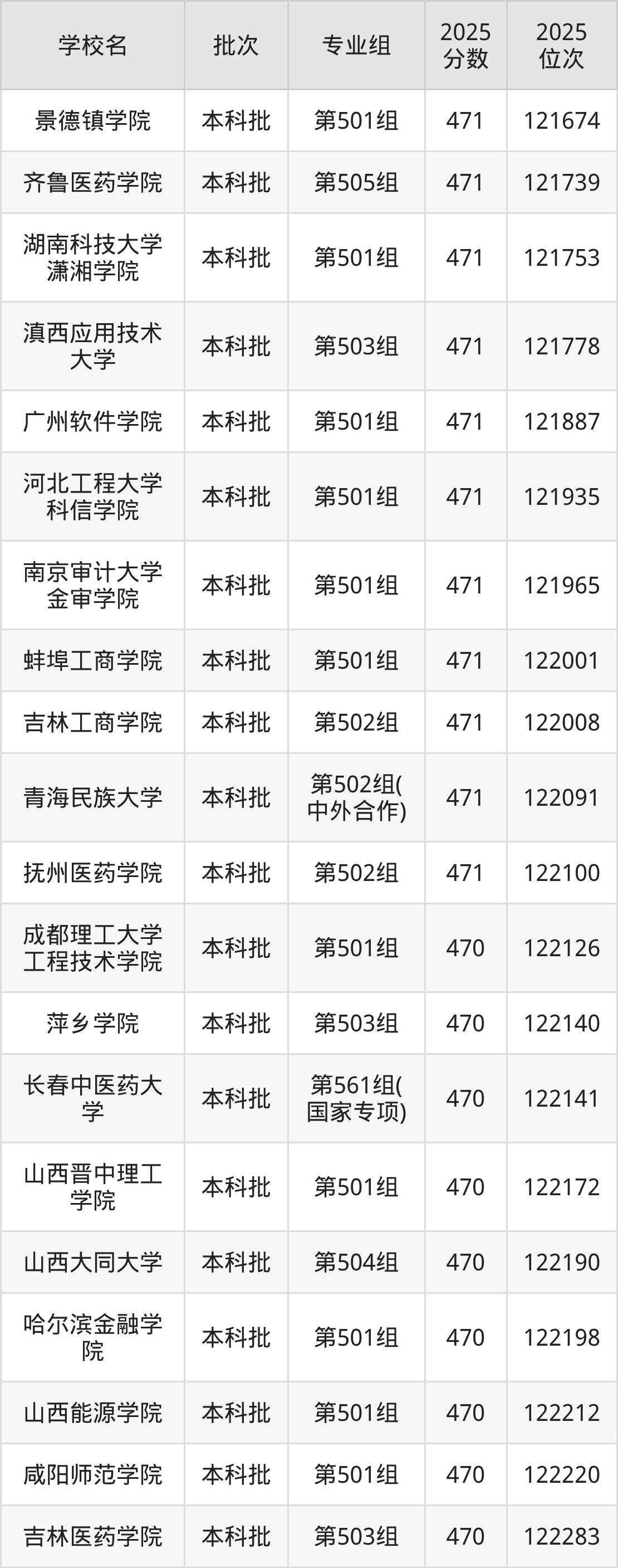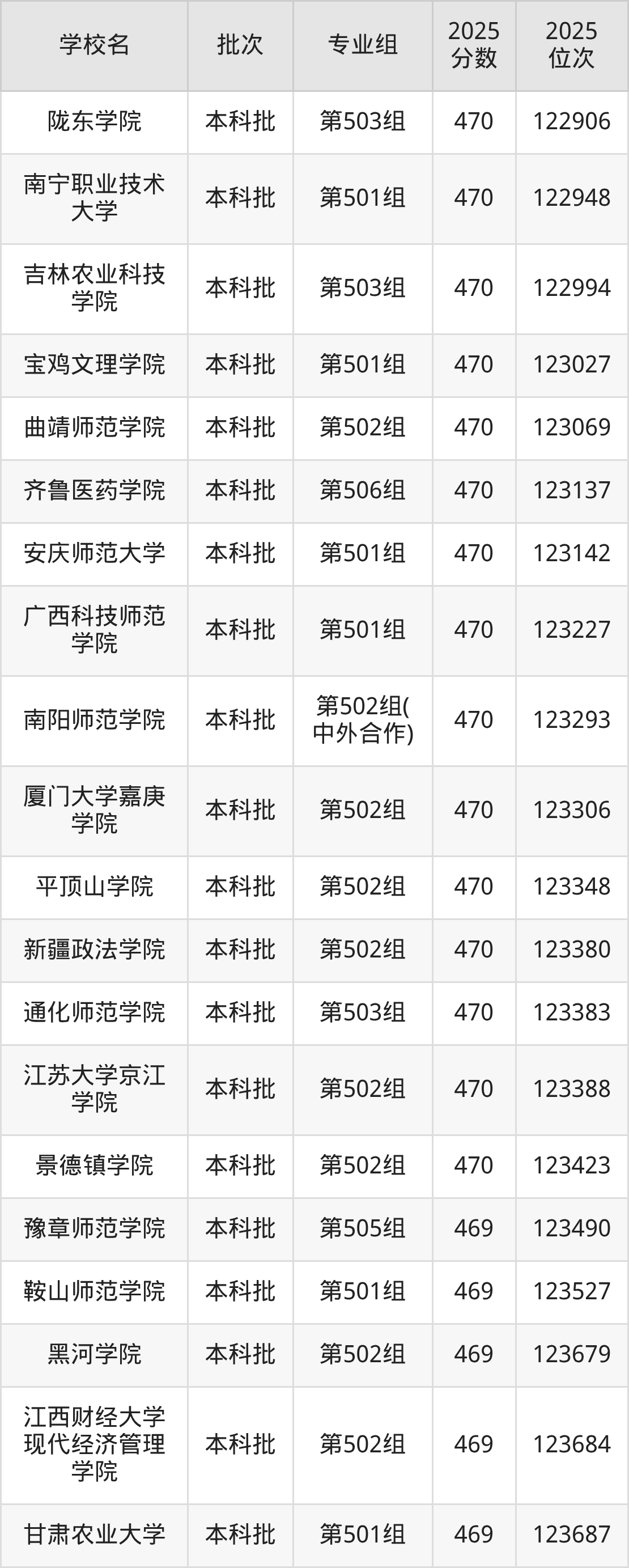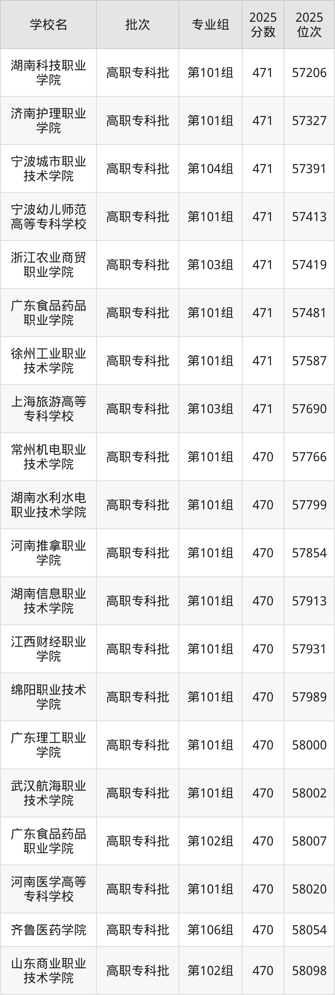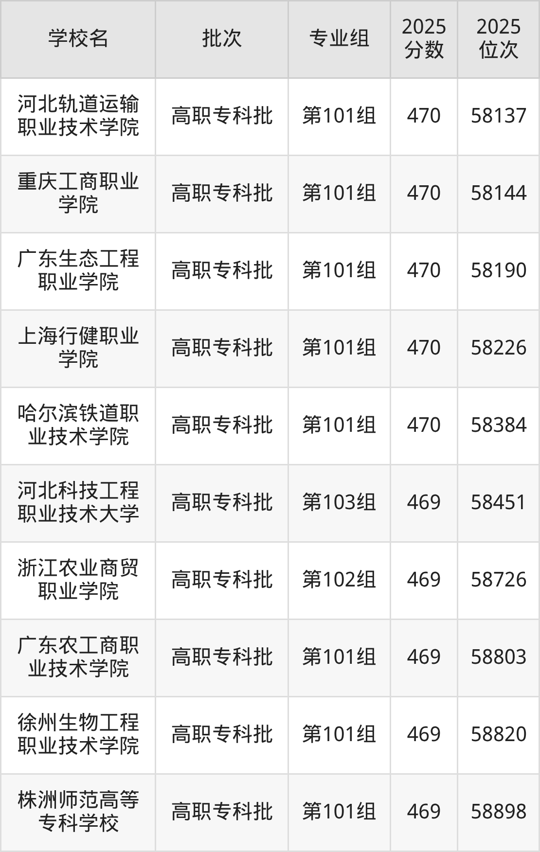 2025年江西高考历史类470分(57694名~58426名)能上的大学有河南医学高等专科学校第101组、哈尔滨铁道职业技术学院第101组、上海行健职业学院第101组、常州机电职业技术学院第101组等。