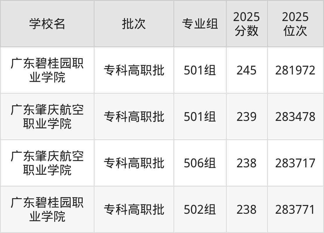 2025年广东高考历史类242分(282679名~282923名)录取位次低于该区间(较稳妥)的有广东肇庆航空职业学院501组(283478名)、广东肇庆航空职业学院506组(283717名)等;录取位次高于该区间(可冲)的有广东碧桂园职业学院501组(281972名)、广州涉外经济职业技术学院513组(粤港合作)(279217名)等。