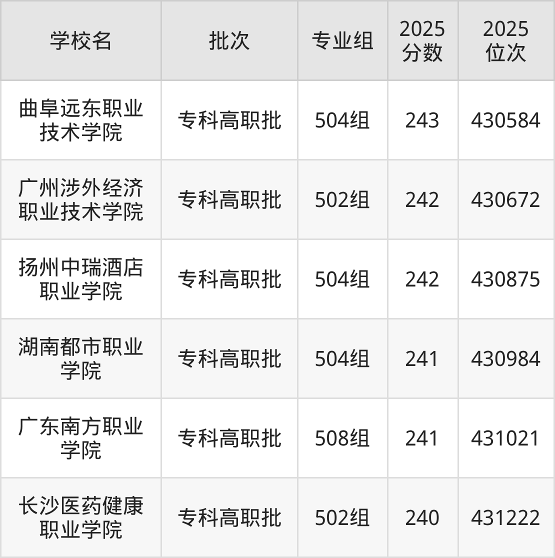 另外录取位次低于该区间(较稳妥)的有湖南都市职业学院504组(430984名)、广东南方职业学院508组(431021名)等;录取位次高于该区间(可冲)的有曲阜远东职业技术学院504组(430584名)、汕尾职业技术学院525组(学分互认)(429621名)等。