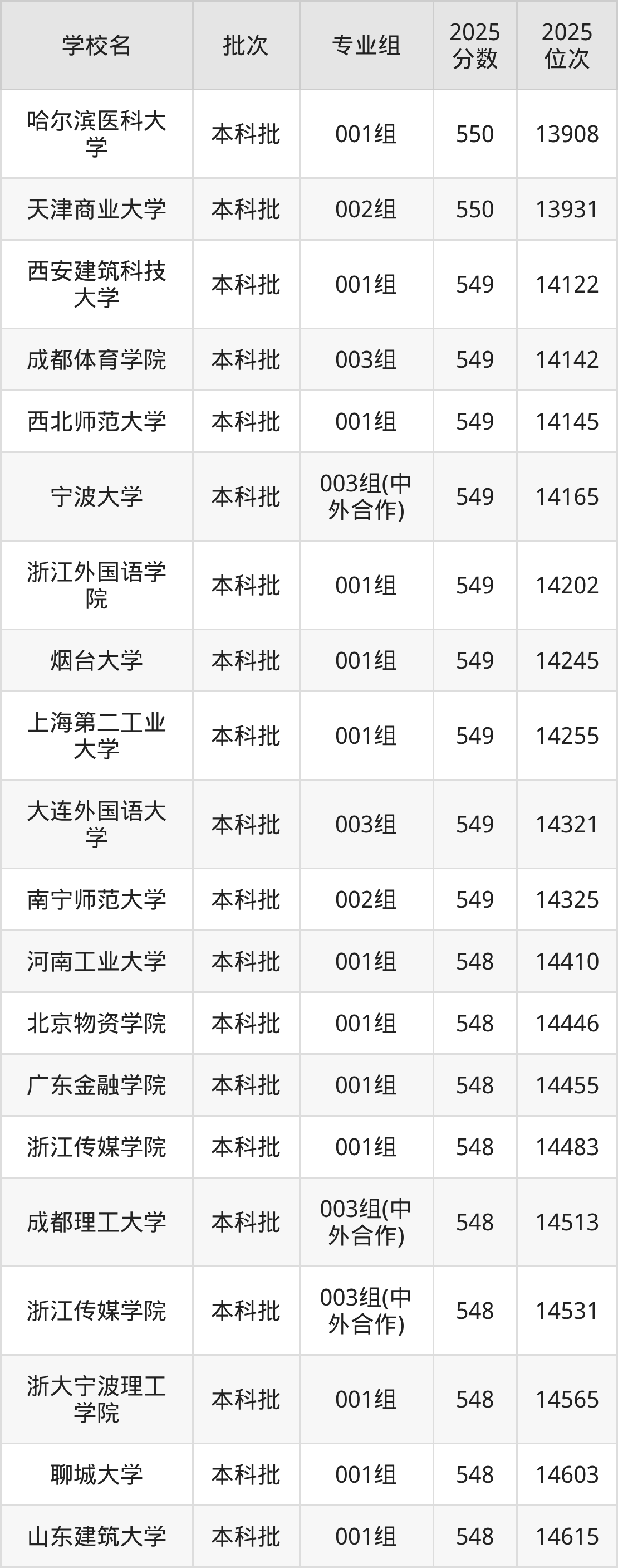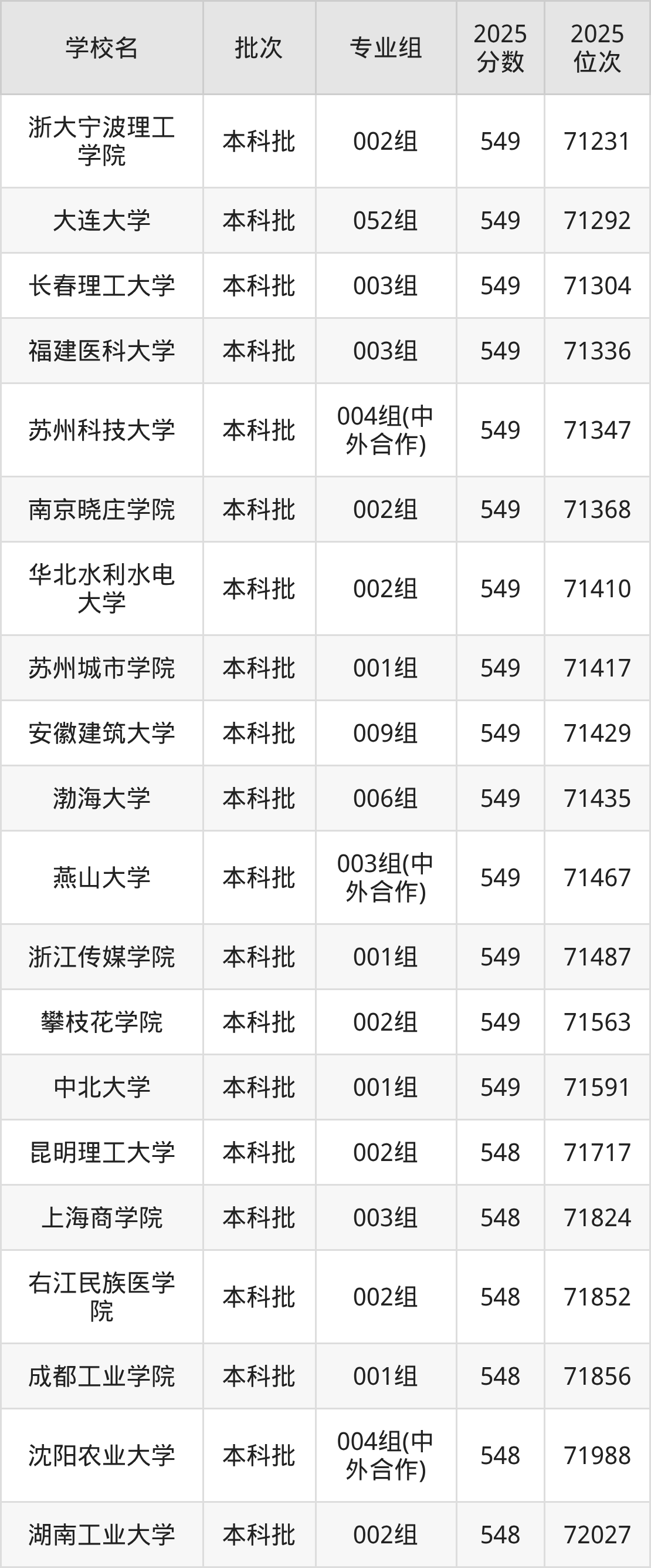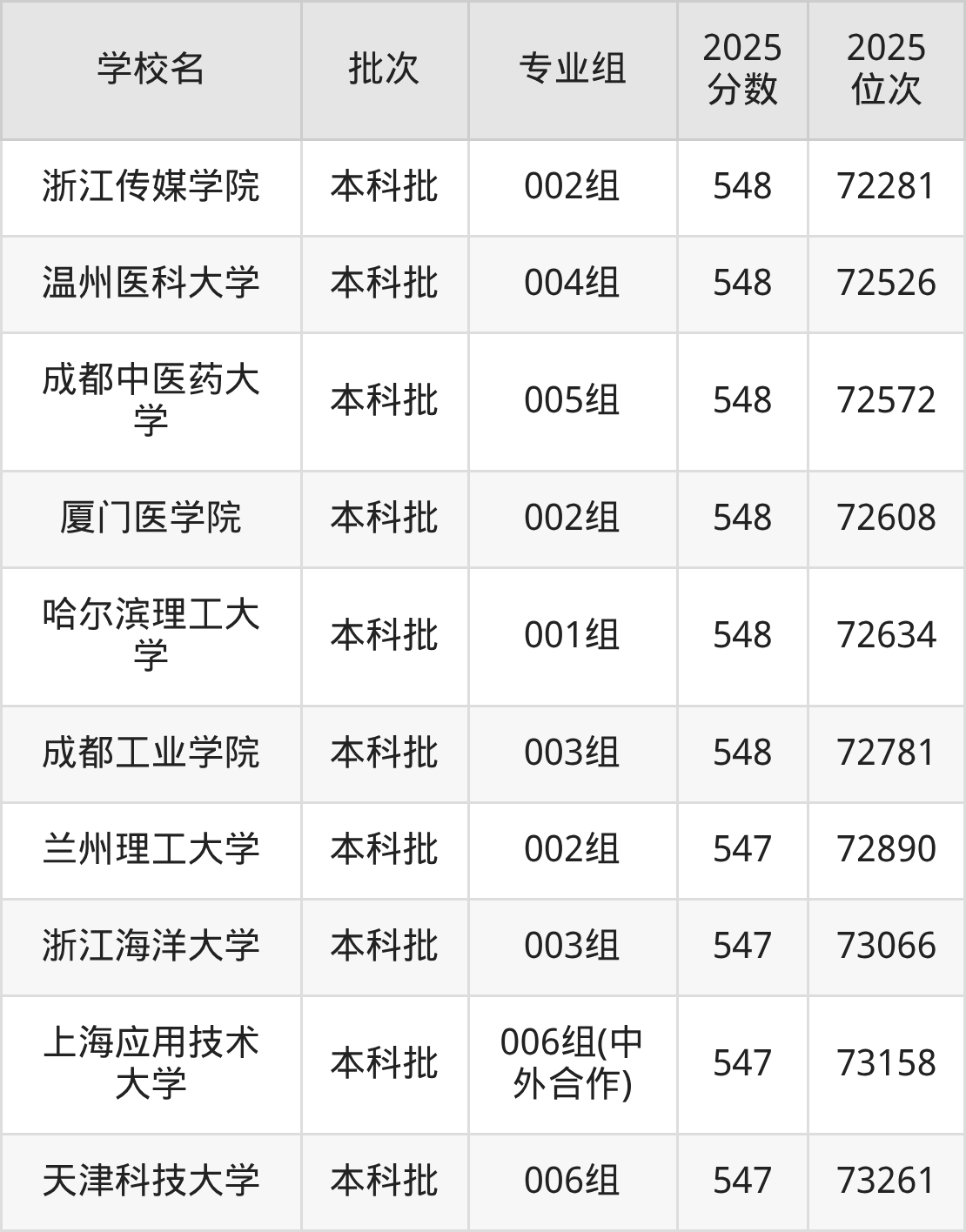 2025年安徽高考物理类548分(71694名~72790名)能上的大学有成都工业学院001组、成都工业学院003组、成都中医药大学005组、哈尔滨理工大学001组等。