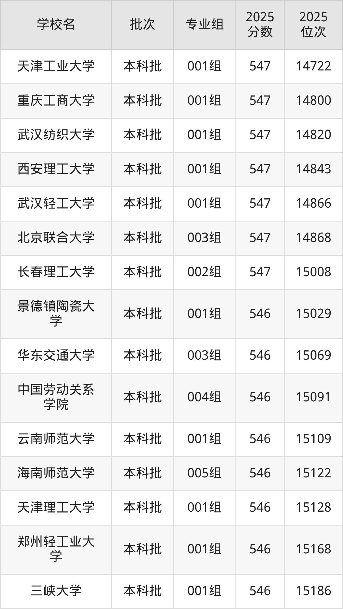 2025年安徽高考历史类548分(14409名~14718名)能上的大学有北京物资学院001组、成都理工大学003组(中外合作)、广东金融学院001组、河南工业大学001组等。