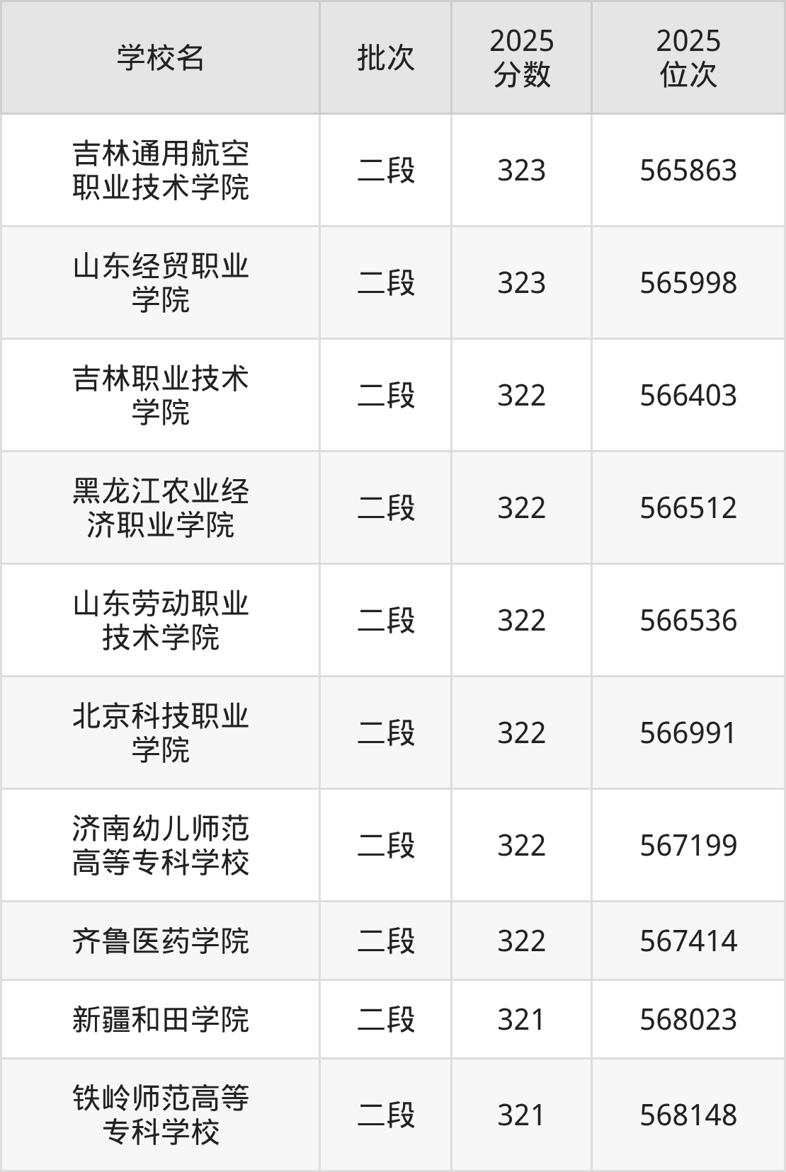 2025年山东高考322分(566298名~567841名)能上的大学有黑龙江农业经济职业学院、山东劳动职业技术学院、济南幼儿师范高等专科学校、北京科技职业学院等。