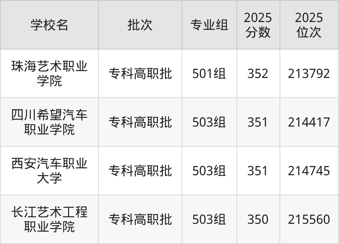 另外录取位次低于该区间(较稳妥)的有长江艺术工程职业学院503组(215560名)、广西经济职业学院505组(215756名)等;录取位次高于该区间(可冲)的有珠海艺术职业学院501组(213792名)、云南理工职业学院504组(213417名)等。
