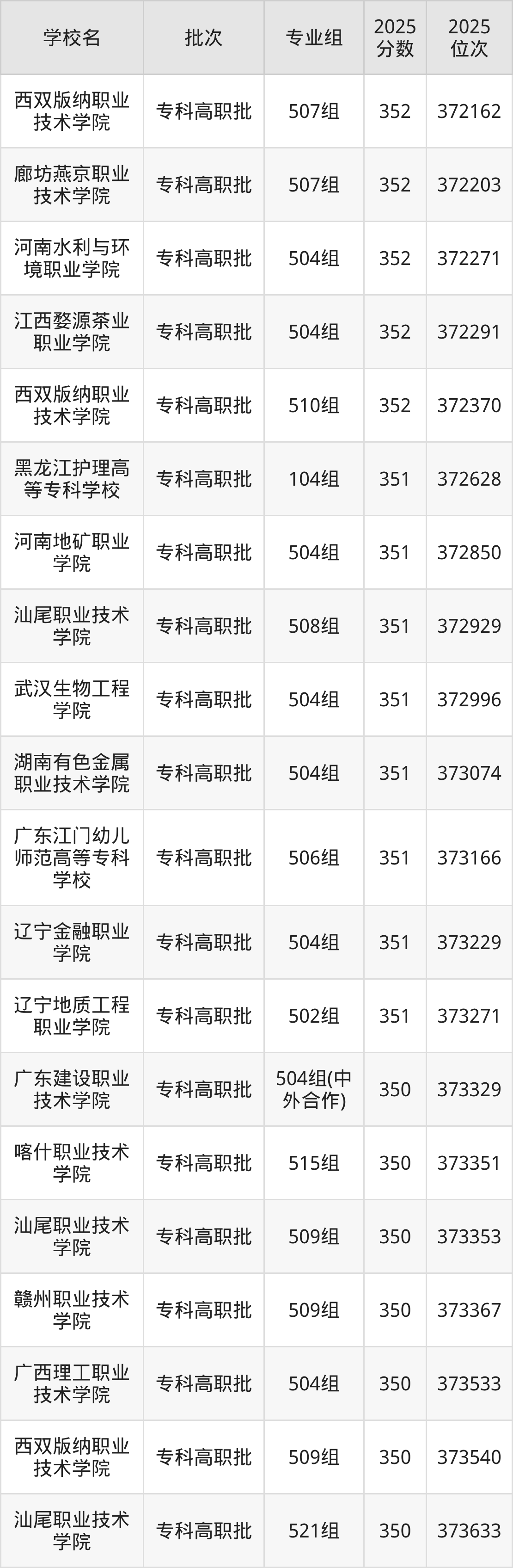 2025年广东高考物理类351分(372488名~373278名)能上的大学有武汉生物工程学院504组、汕尾职业技术学院508组、辽宁金融职业学院504组、辽宁地质工程职业学院502组等。