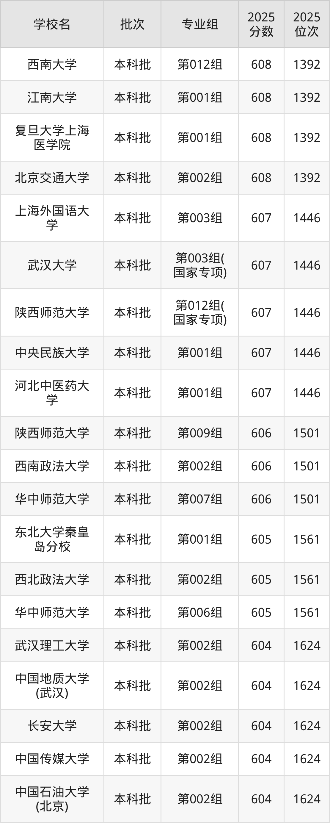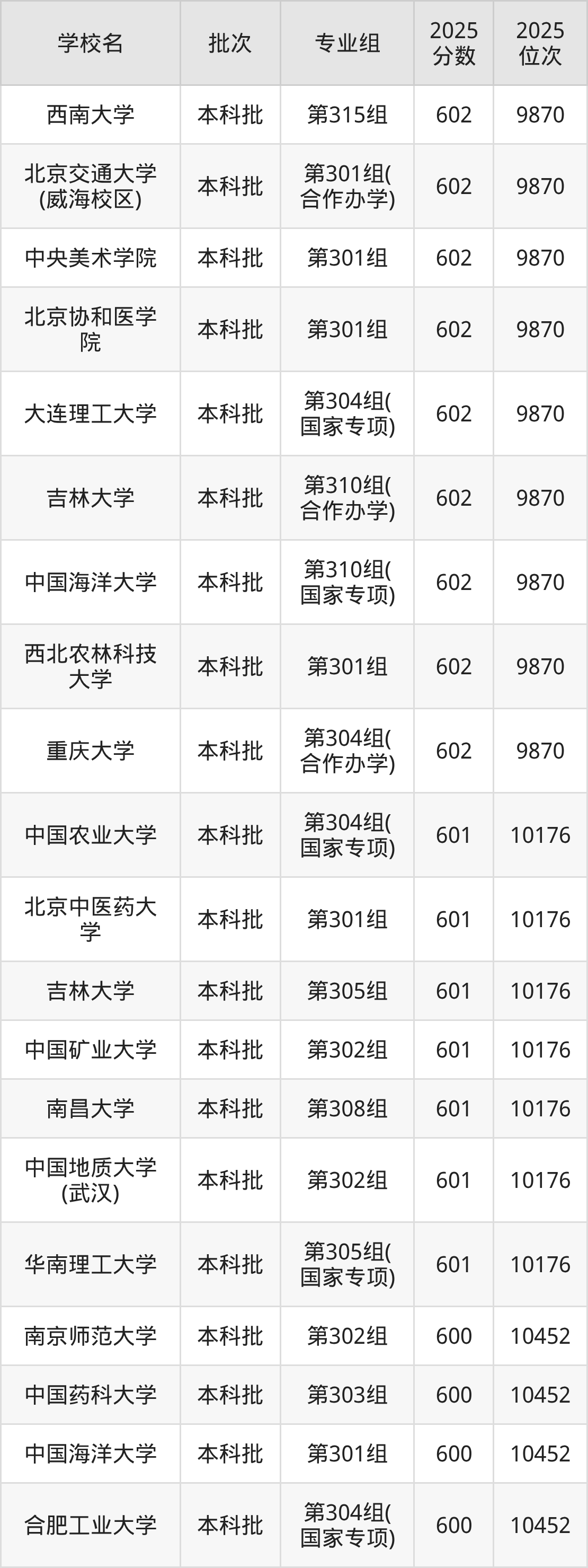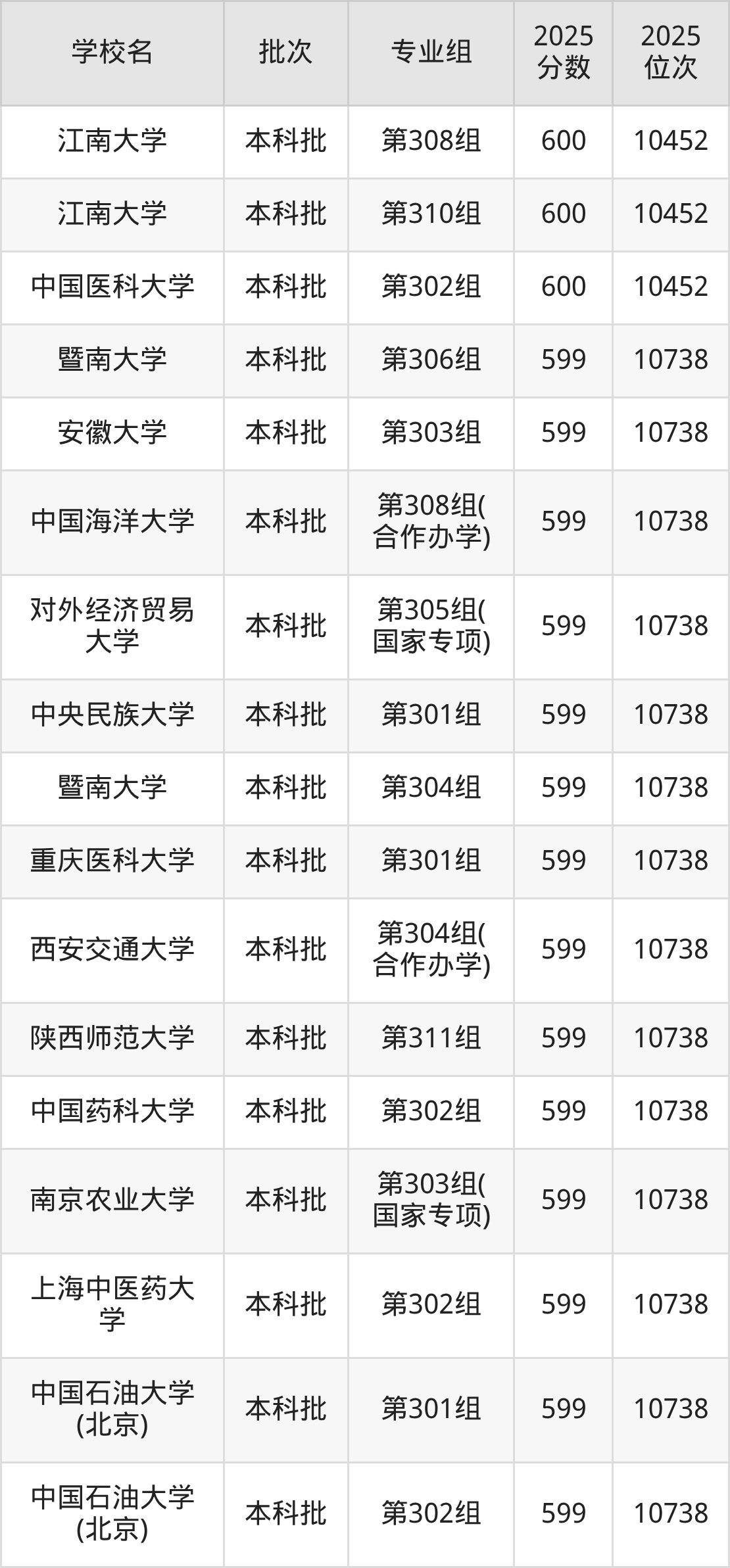 2025年山西高考物理类600分(10177名~10452名)能上的大学有中国医科大学第302组、江南大学第308组、江南大学第310组、中国药科大学第303组等。