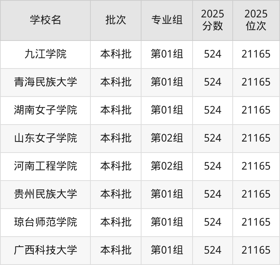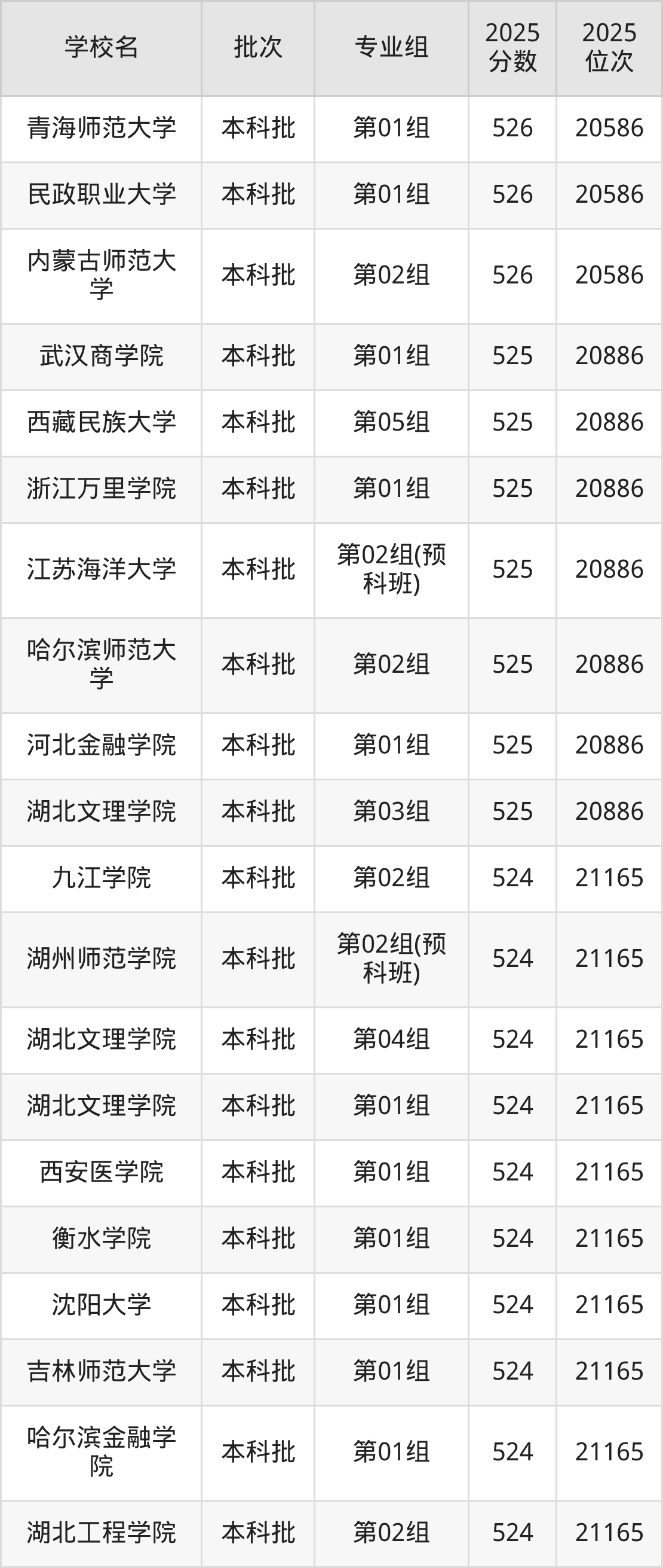 2025年湖北高考历史类525分(20587名~20886名)能上的大学有湖北文理学院第03组、武汉商学院第01组、河北金融学院第01组、哈尔滨师范大学第02组等。