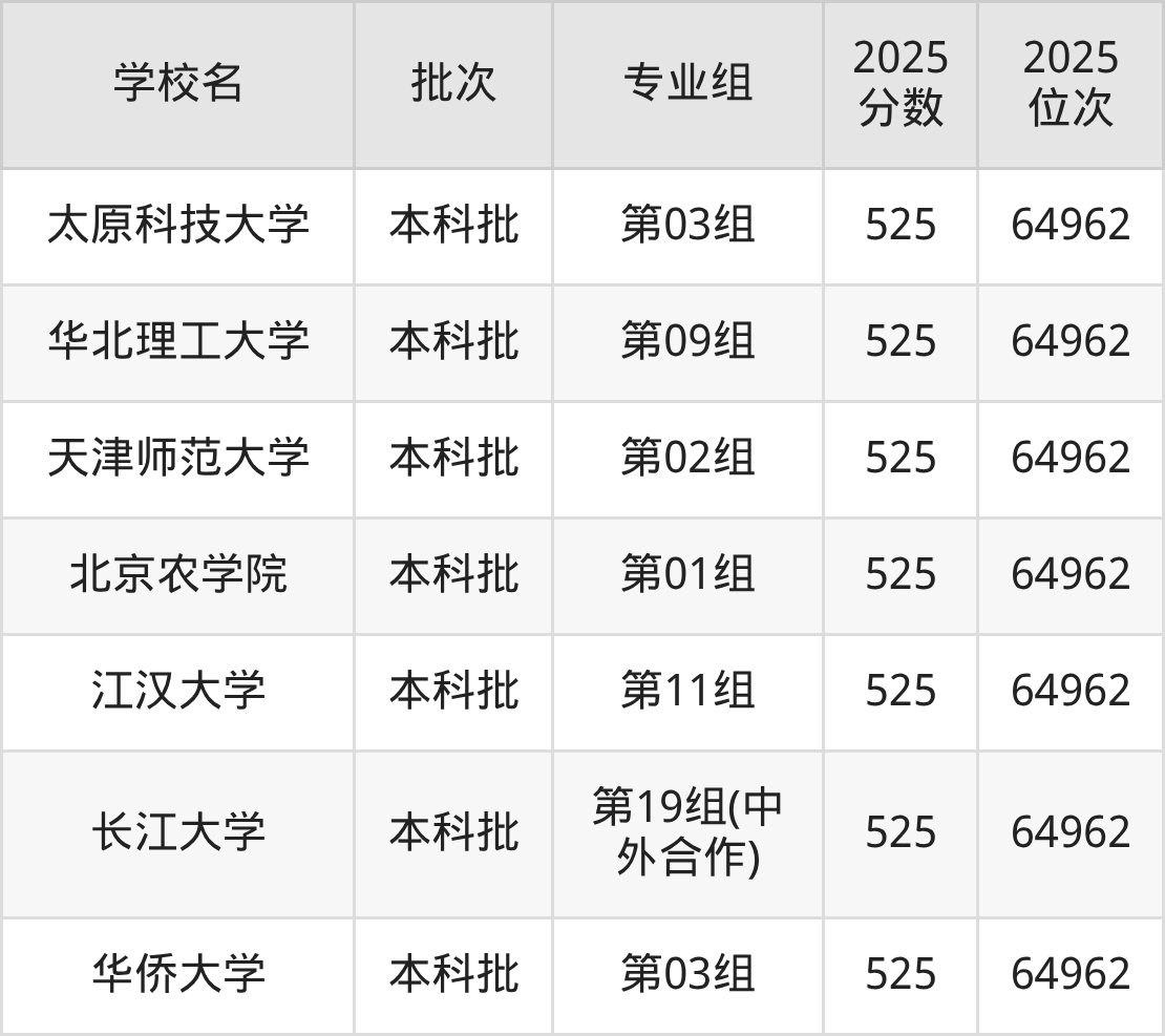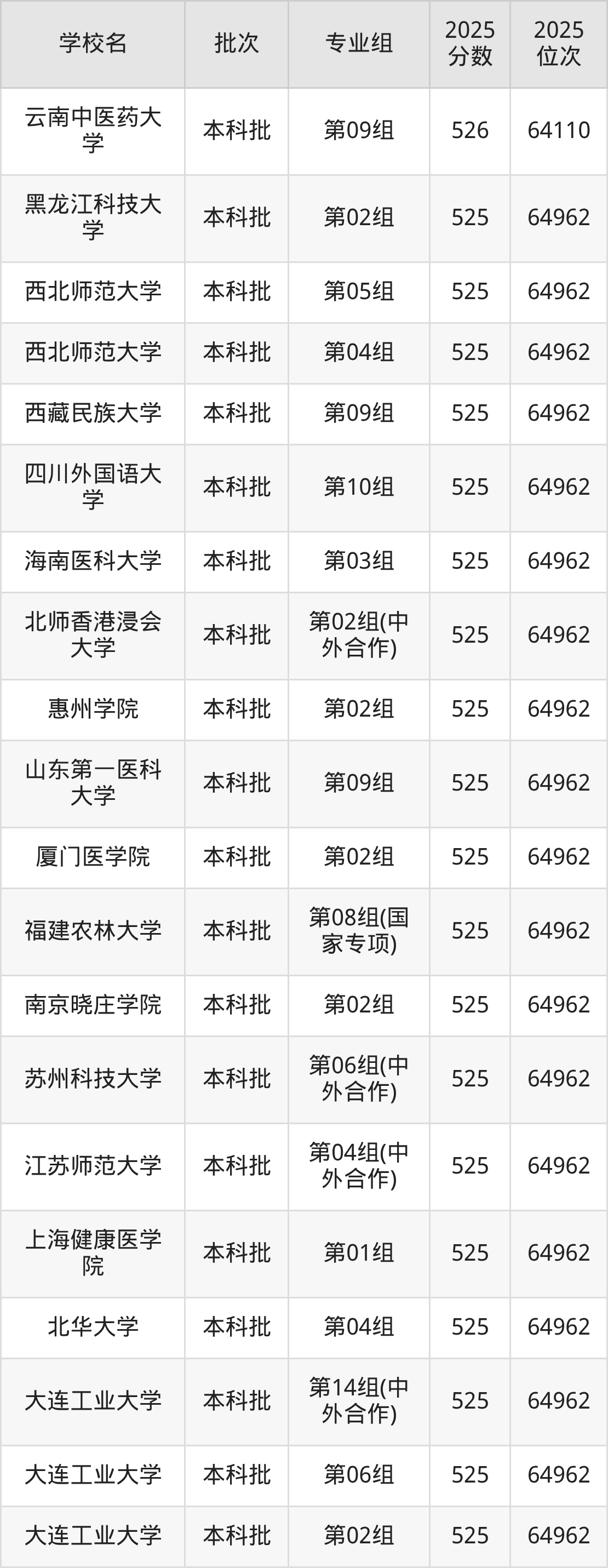 2025年湖北高考物理类525分(64111名~64962名)能上的大学有华侨大学第03组、长江大学第19组(中外合作)、江汉大学第11组、北京农学院第01组等。
