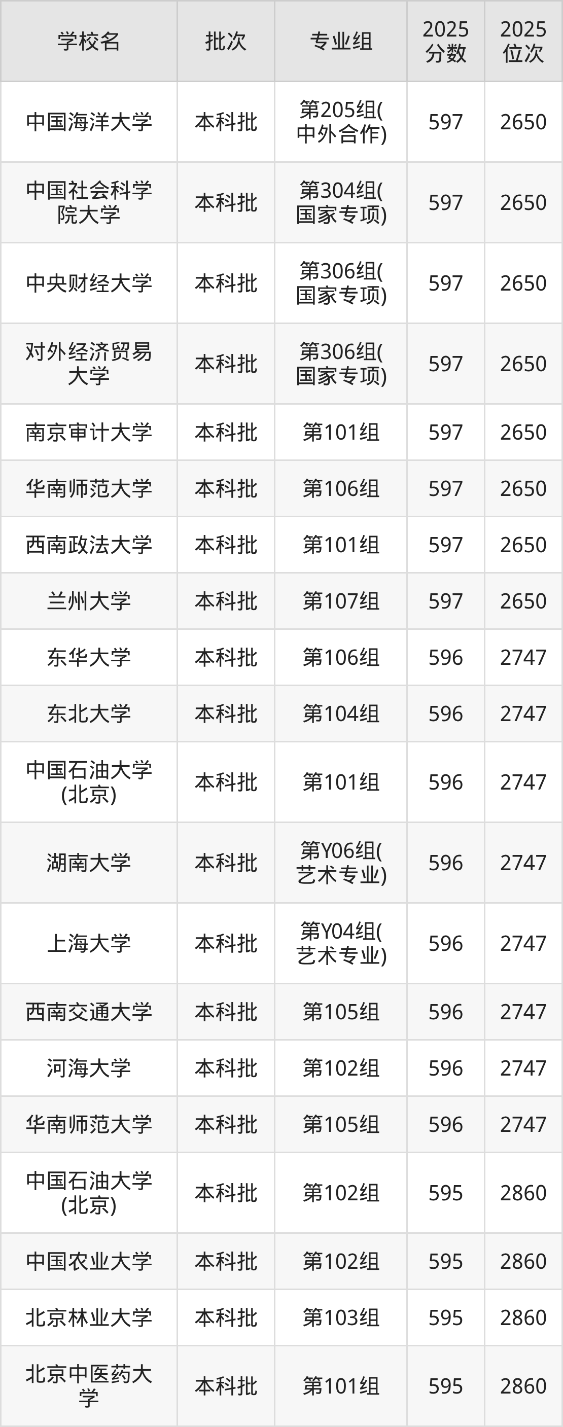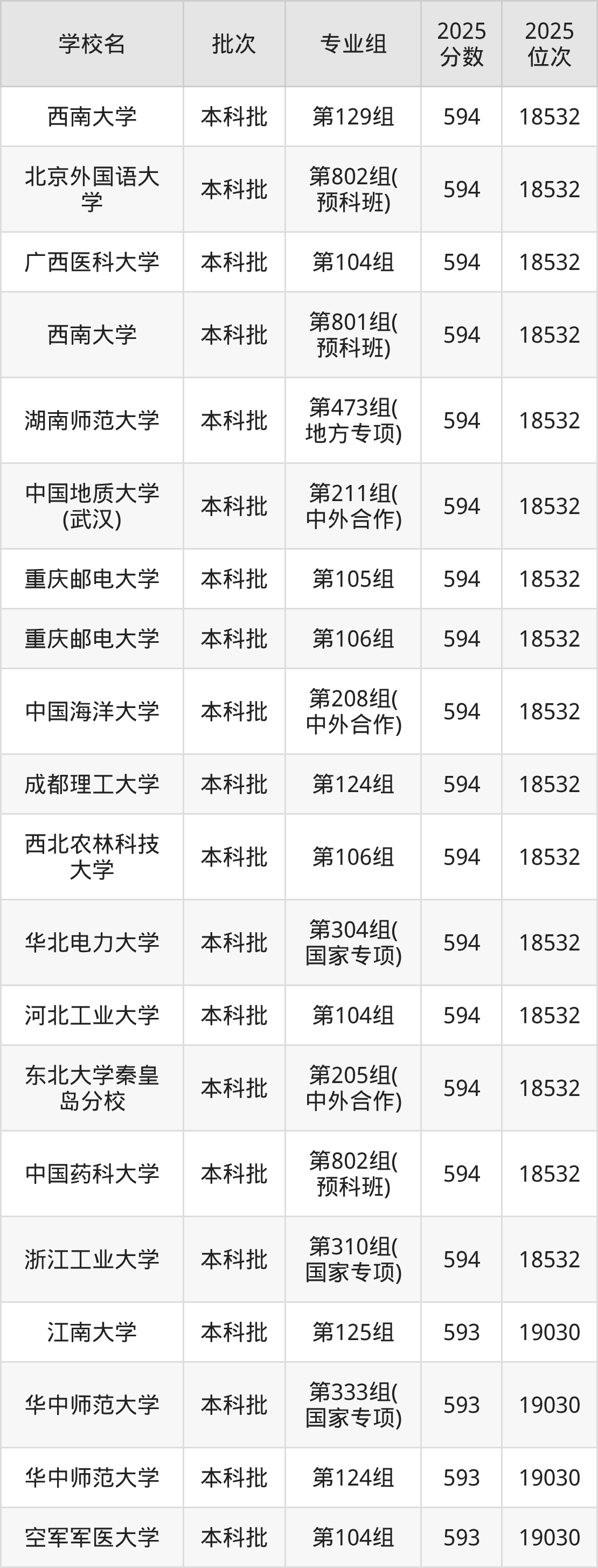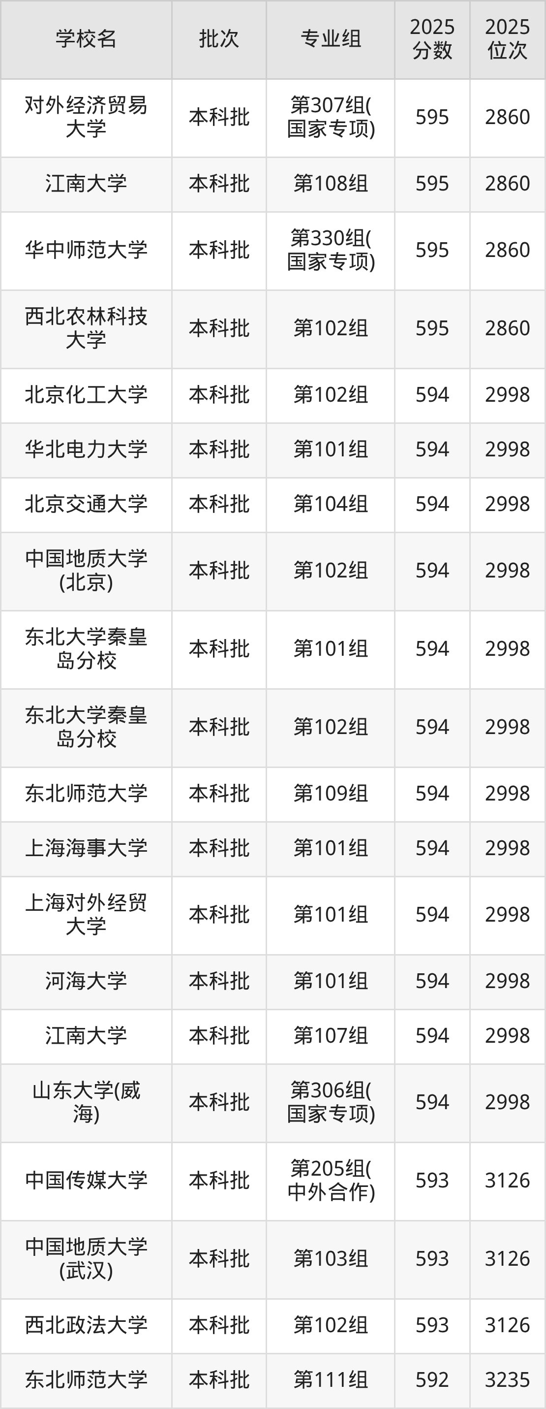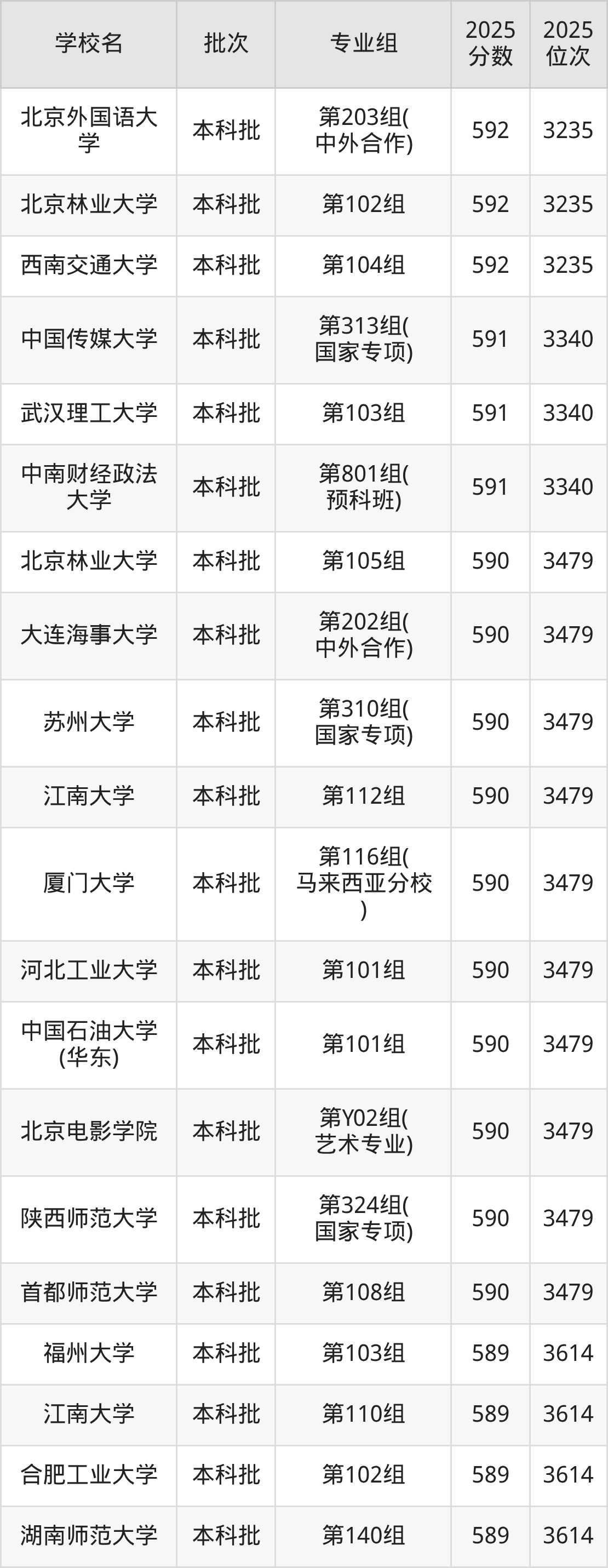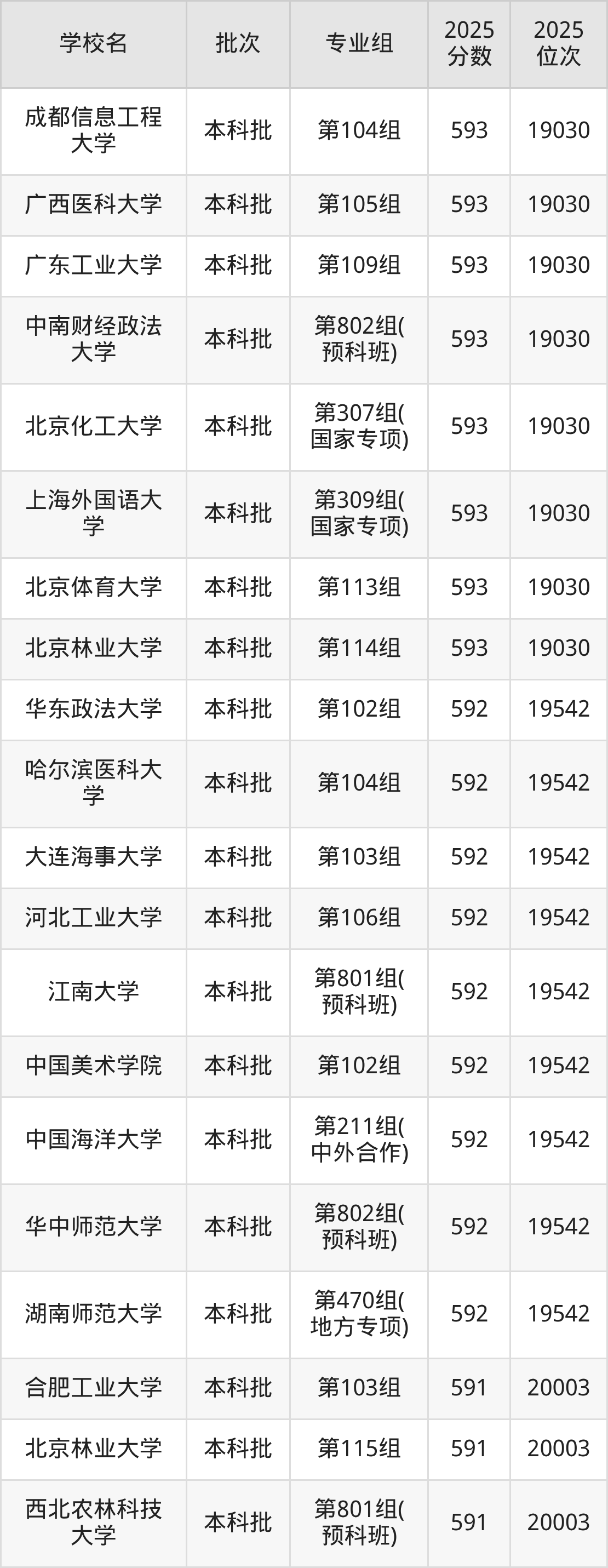 2025年湖南高考历史类592分(3127名~3235名)能上的大学有北京林业大学第102组、北京外国语大学第203组(中外合作)、东北师范大学第111组、西南交通大学第104组。