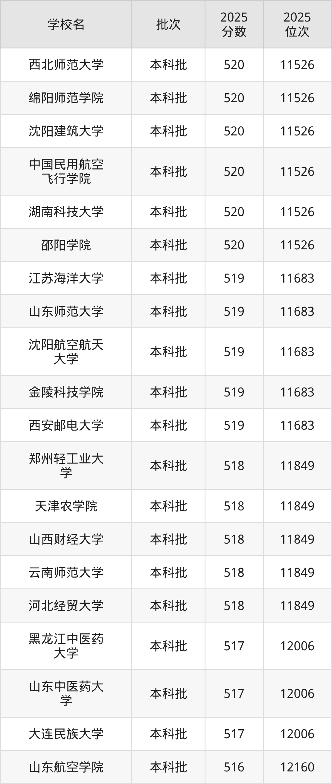 2025年辽宁高考历史类516分(12007名~12160名)能上的大学有四川旅游学院、山东航空学院。