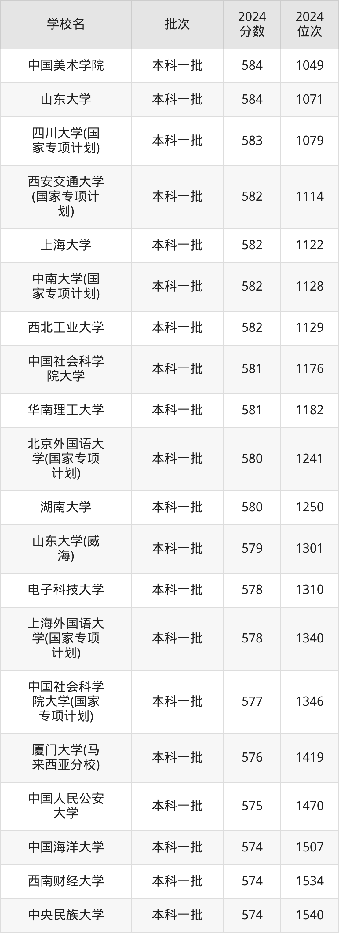 由于高考录取分数线历年波动较大,因此本文以该分数对应的位次排名为大家整理能上的大学名单。