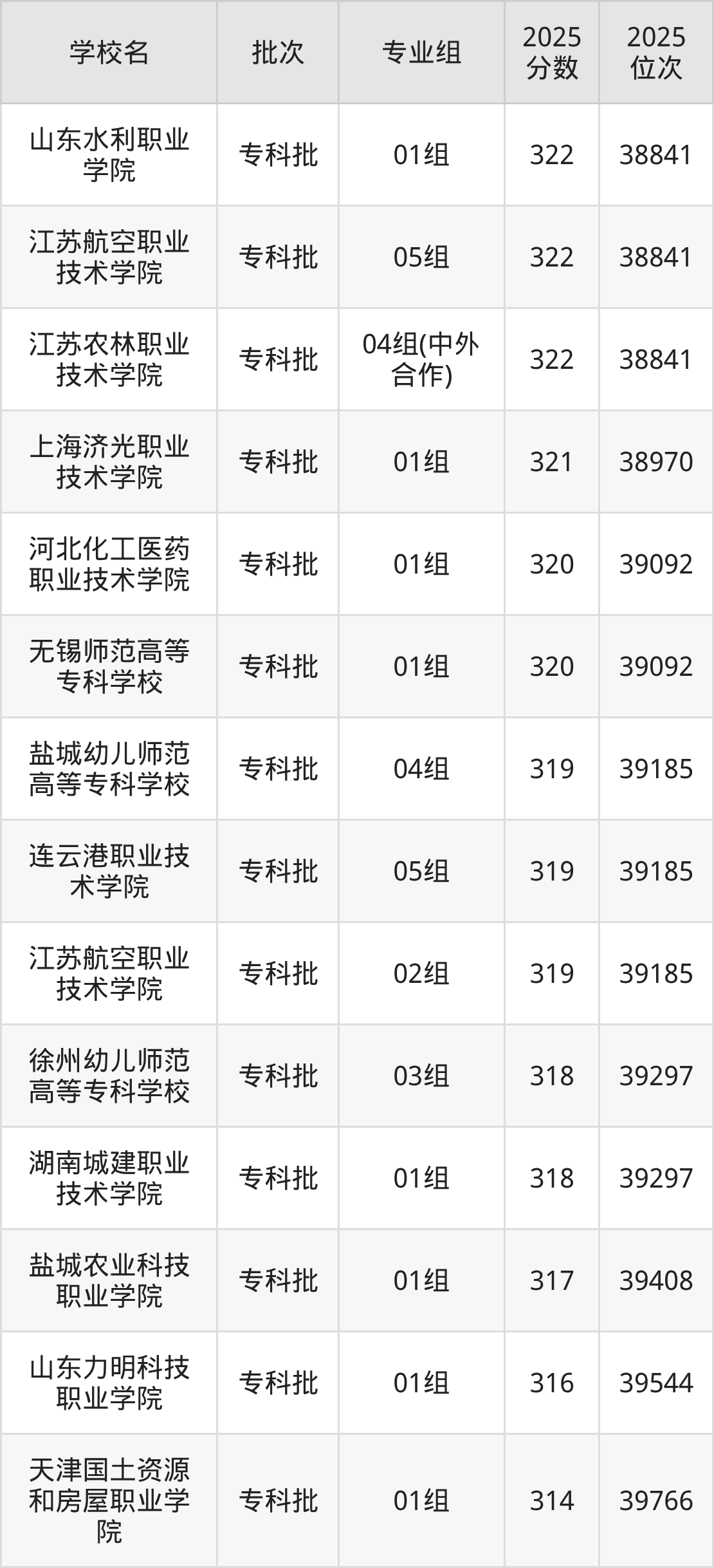 2025年江苏高考历史类318分(39186名~39297名)能上的大学有徐州幼儿师范高等专科学校03组、湖南城建职业技术学院01组。
