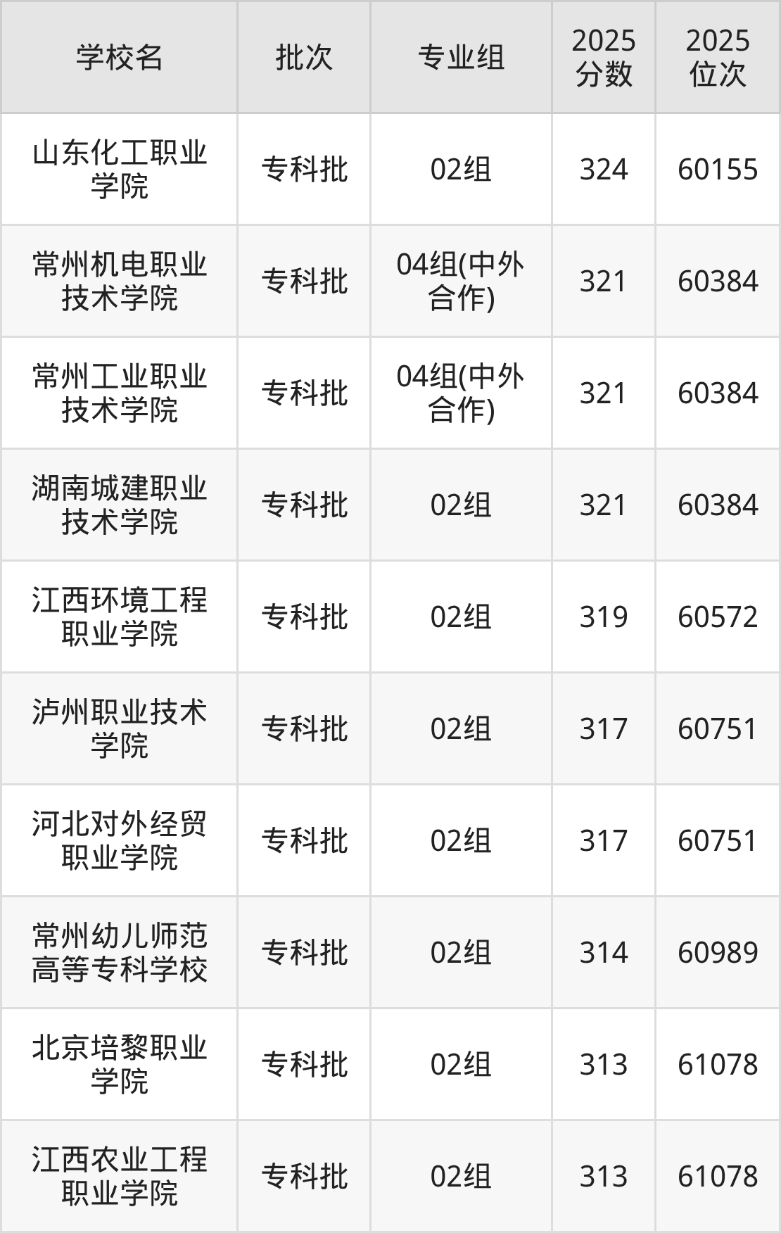 2025年江苏高考物理类318分(60573名~60667名)录取位次低于该区间(较稳妥)的有泸州职业技术学院02组(60751名)、河北对外经贸职业学院02组(60751名)等;录取位次高于该区间(可冲)的有江西环境工程职业学院02组(60572名)、常州工业职业技术学院04组(中外合作)(60384名)等。