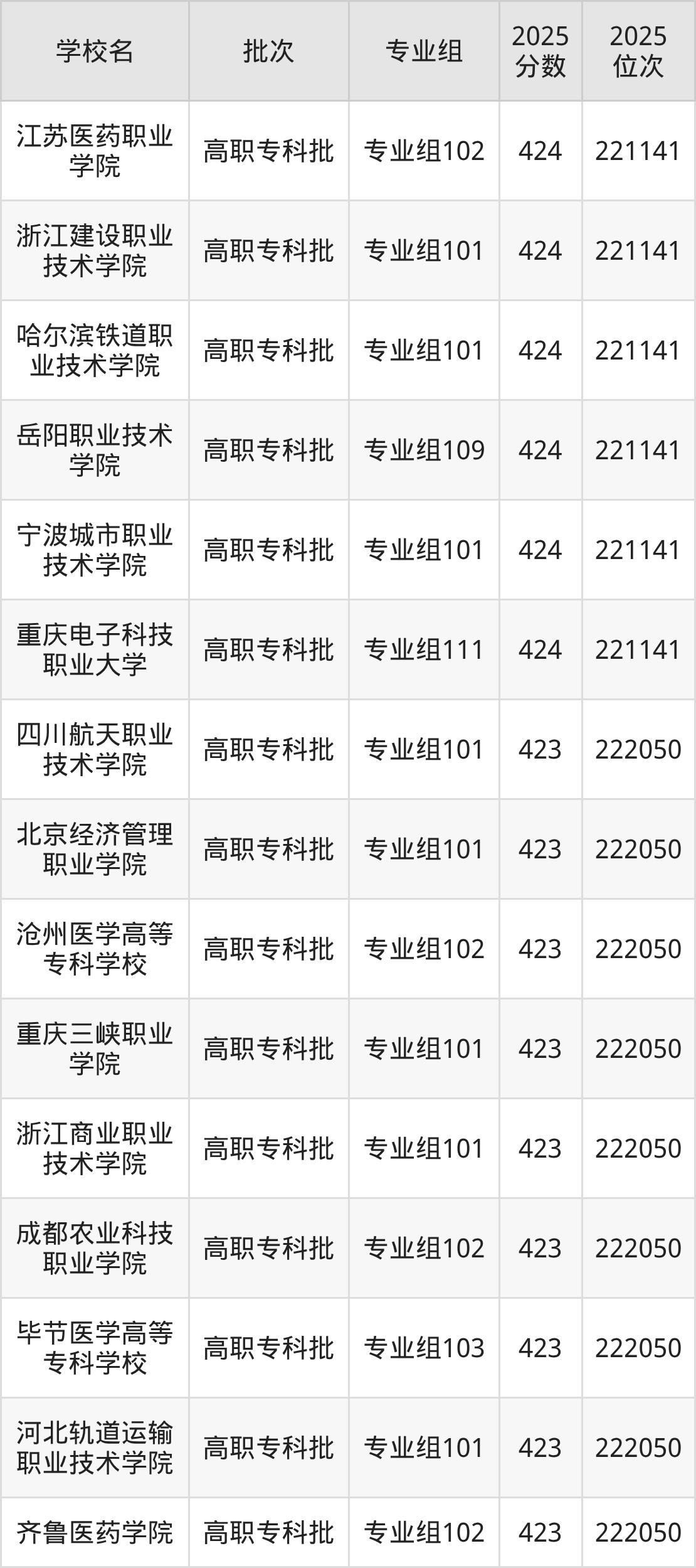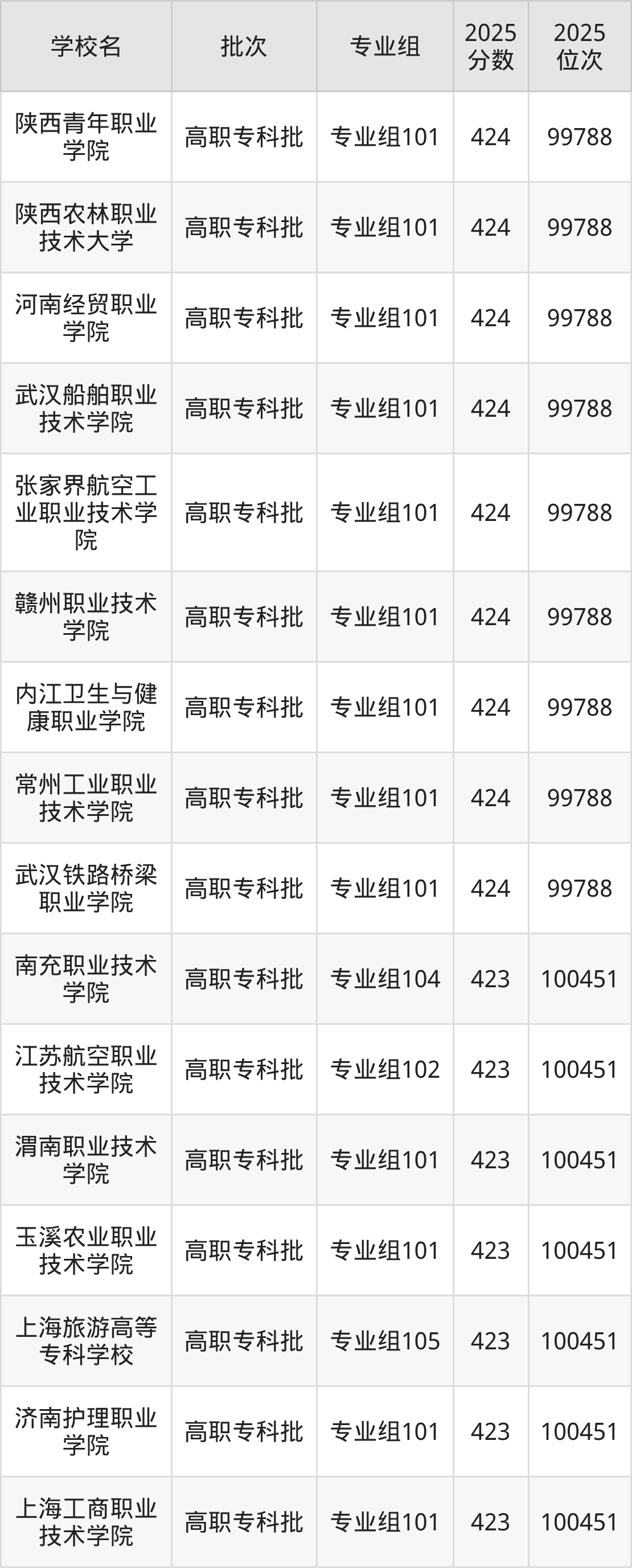 2025年四川高考历史类423分(99789名~100451名)能上的大学有南充职业技术学院专业组104、济南护理职业学院专业组101、上海工商职业技术学院专业组101、上海旅游高等专科学校专业组105等。