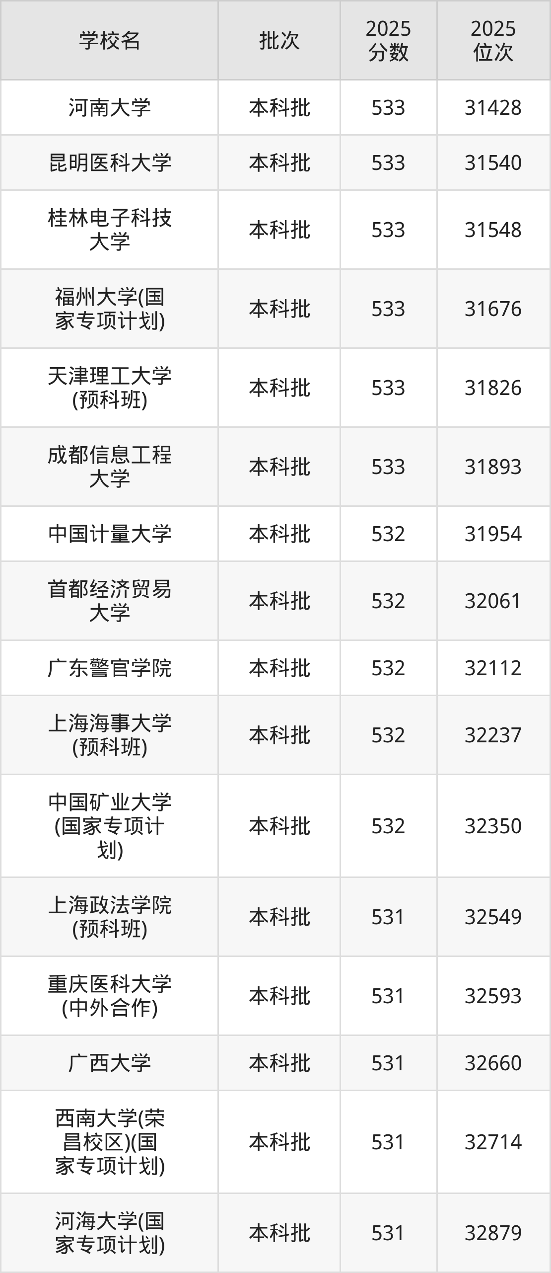 2025年贵州高考物理类532分(31895名~32410名)能上的大学有广东警官学院、上海海事大学(预科班)、首都经济贸易大学、中国计量大学等。