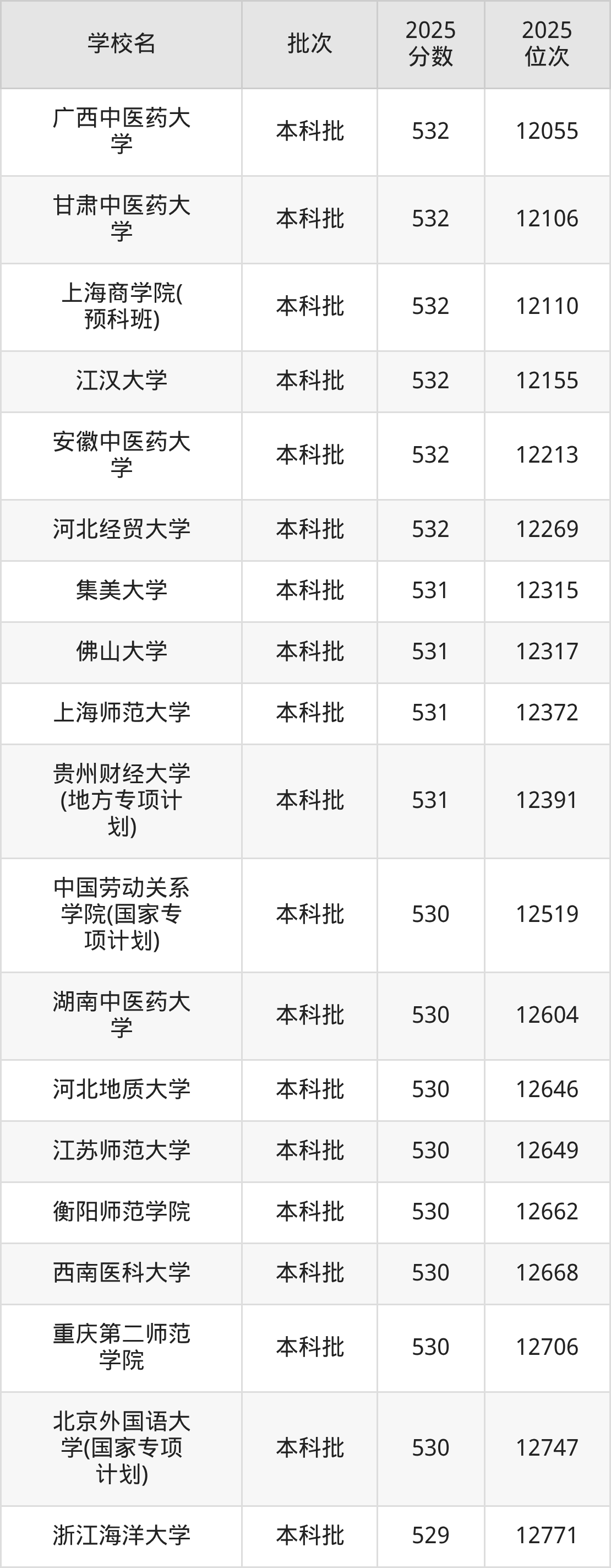 2025年贵州高考历史类532分(12027名~12272名)能上的大学有上海商学院(预科班)、广西中医药大学、甘肃中医药大学、江汉大学等。