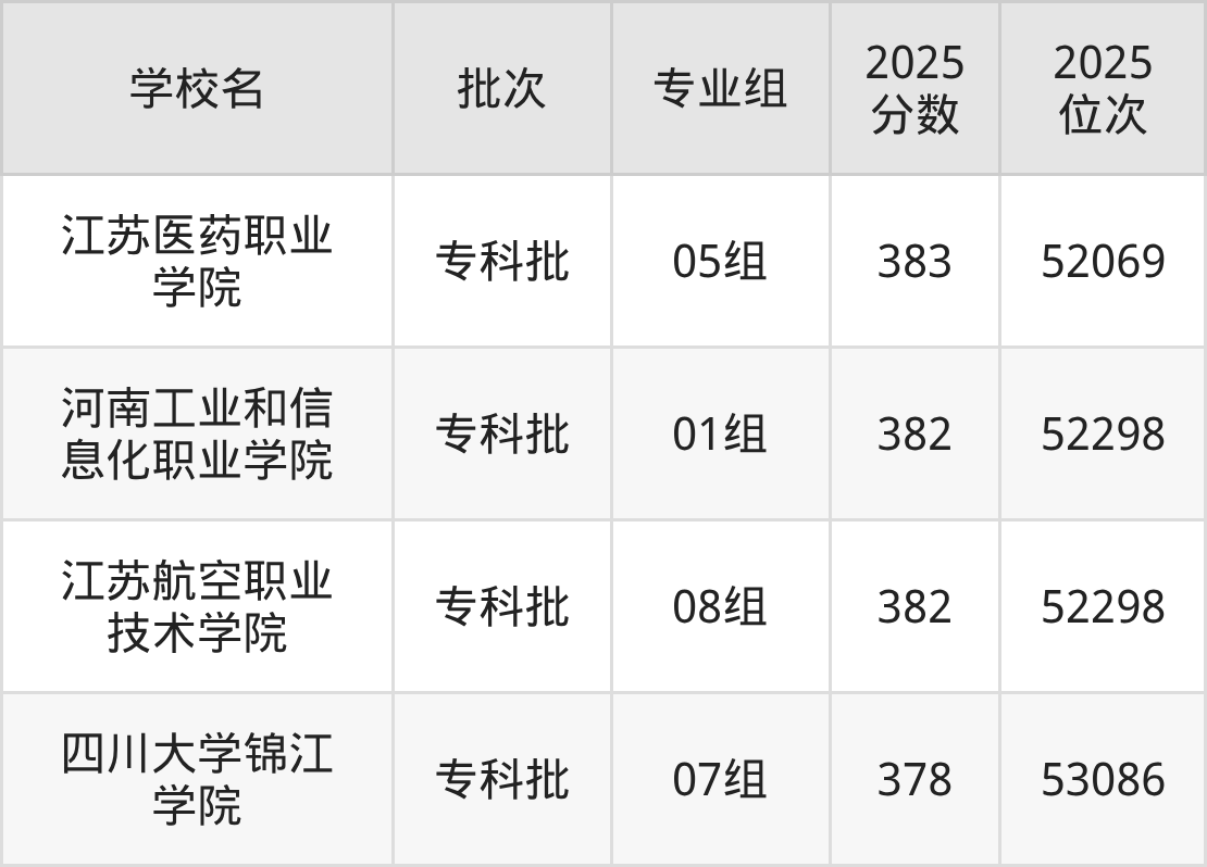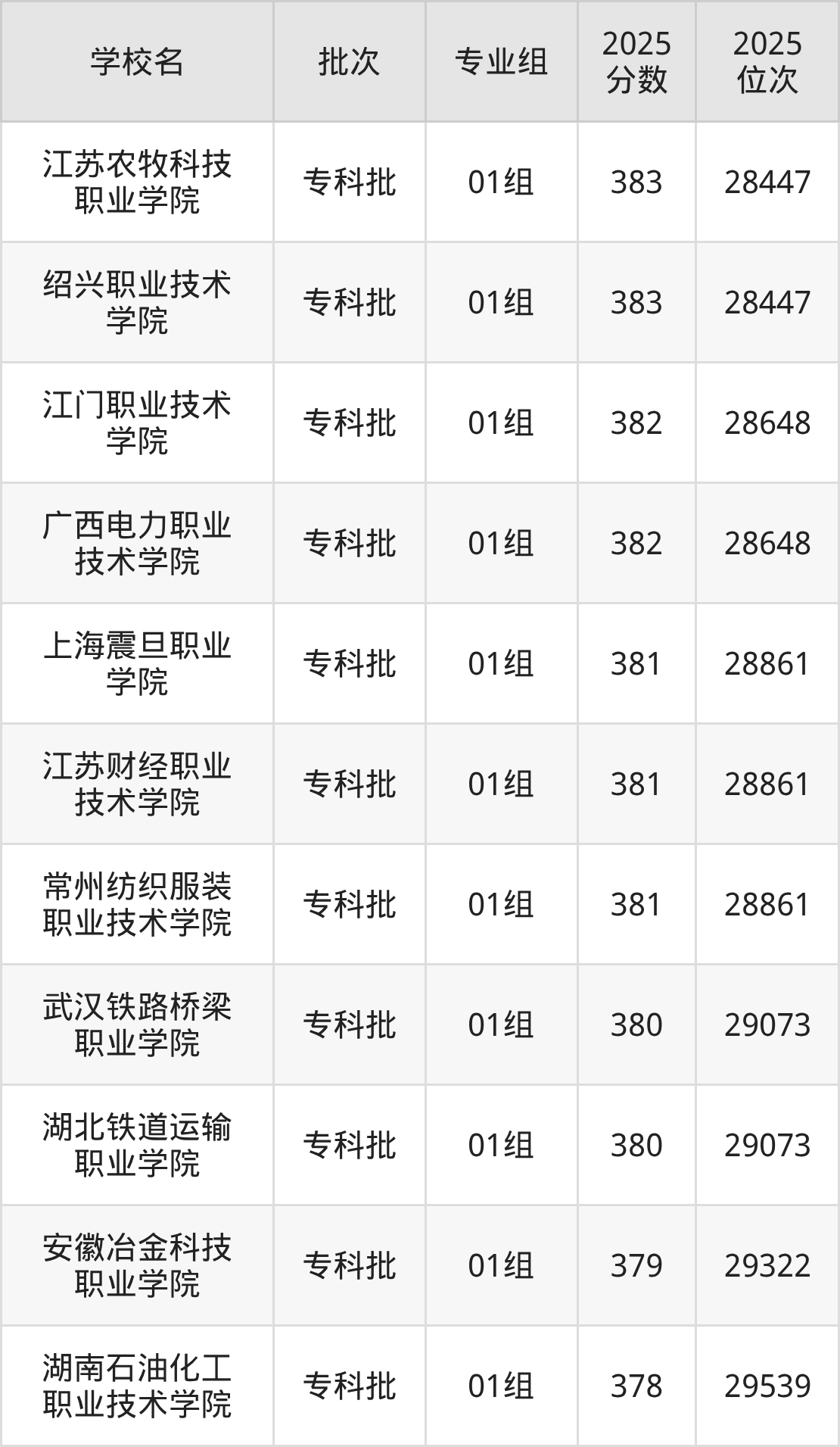 2025年江苏高考历史类380分(28862名~29073名)能上的大学有湖北铁道运输职业学院01组、武汉铁路桥梁职业学院01组。