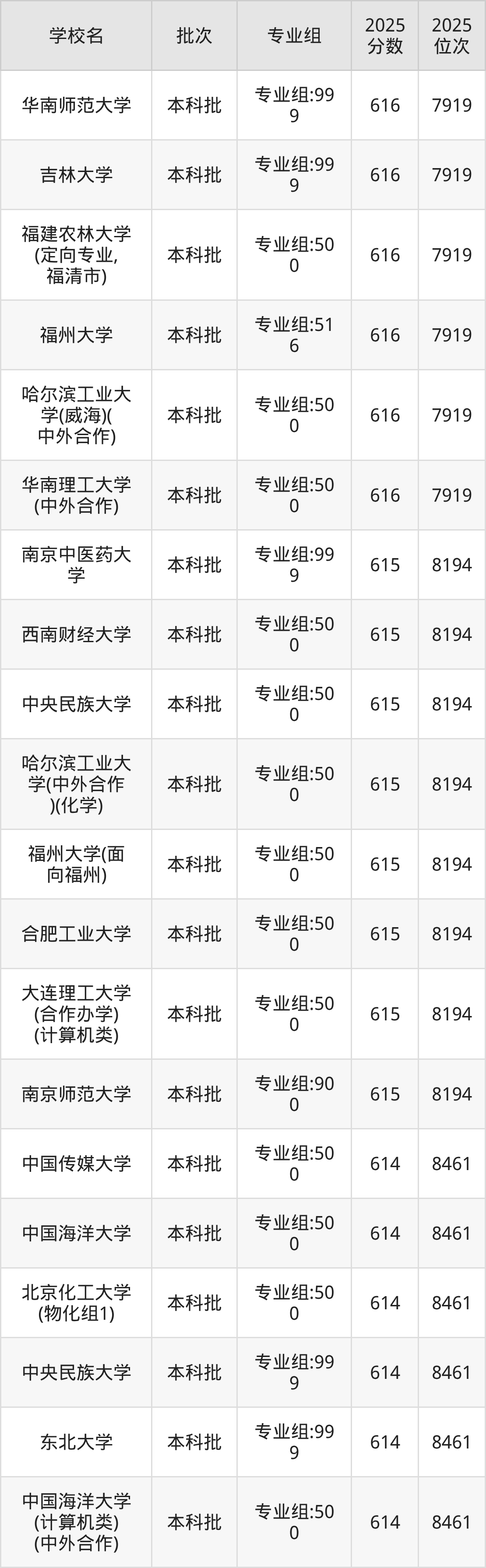2025年福建高考历史类614分(936名~986名)能上的大学有华中师范大学专业组:700、华中师范大学专业组:999。