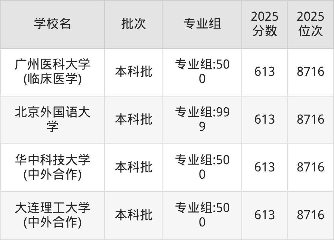 另外录取位次低于该区间(较稳妥)的有广州医科大学(临床医学)专业组:500(8716名)、华中科技大学(中外合作)专业组:500(8716名)等;录取位次高于该区间(可冲)的有福州大学(面向福州)专业组:500(8194名)、大连理工大学(合作办学)(计算机类)专业组:500(8194名)等。