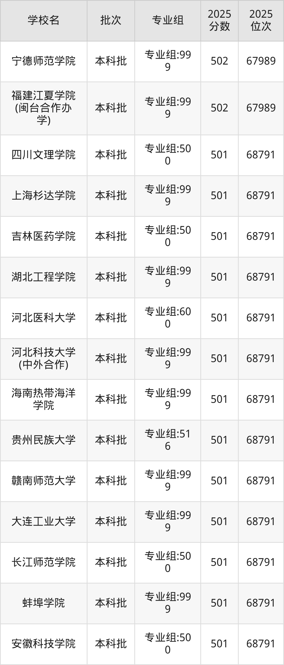 2025年福建高考物理类501分(67990名~68791名)能上的大学有安徽科技学院专业组:500、蚌埠学院专业组:999、长江师范学院专业组:500、大连工业大学专业组:999等。