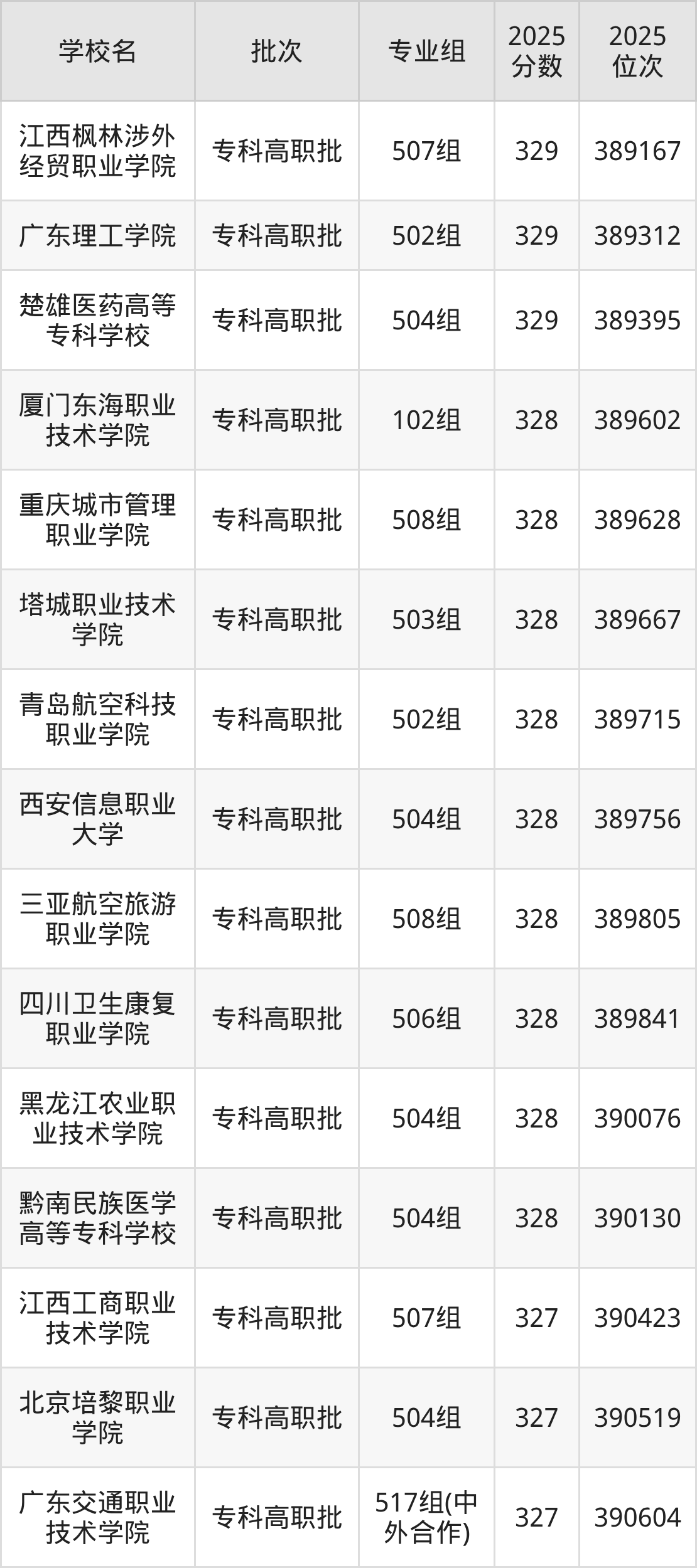 另外录取位次低于该区间(较稳妥)的有江西工商职业技术学院507组(390423名)、北京培黎职业学院504组(390519名)等;录取位次高于该区间(可冲)的有楚雄医药高等专科学校504组(389395名)、广东理工学院502组(389312名)等。