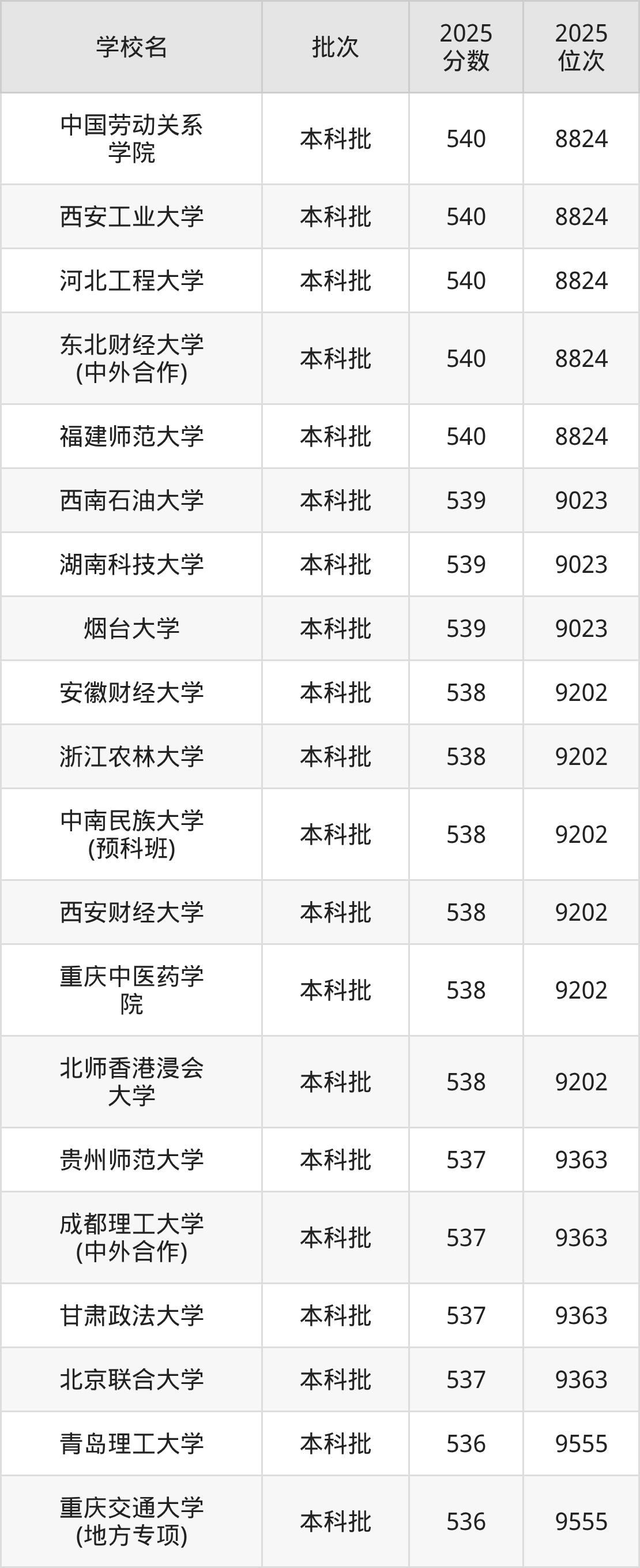 2025年重庆高考历史类537分(9203名~9363名)能上的大学有贵州师范大学、甘肃政法大学、成都理工大学(中外合作)、北京联合大学。