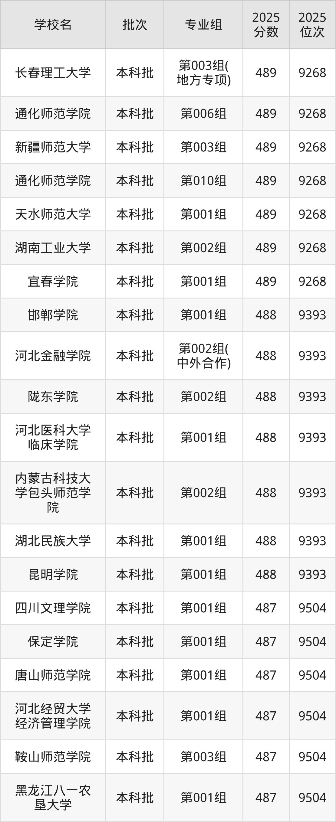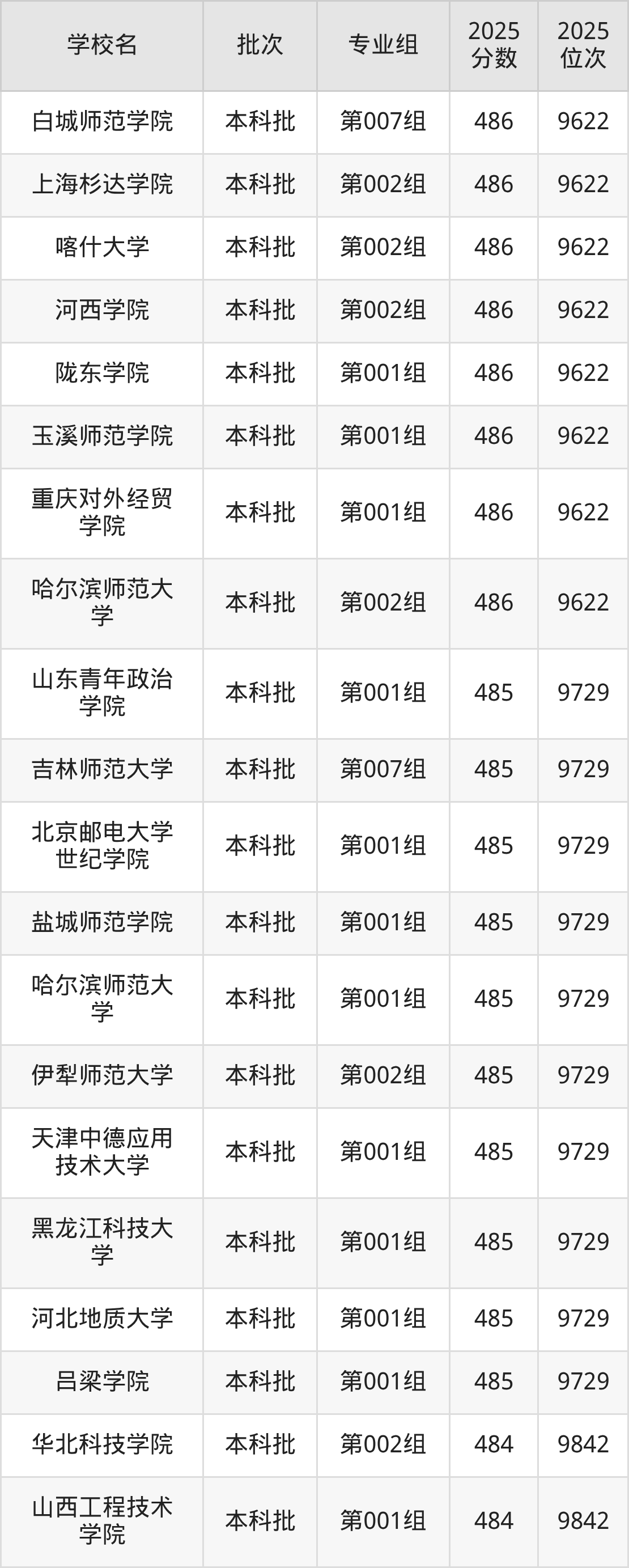 2025年吉林高考历史类484分(9730名~9842名)能上的大学有华北科技学院第002组、山西工程技术学院第001组、长春大学第008组、淮北师范大学第003组。