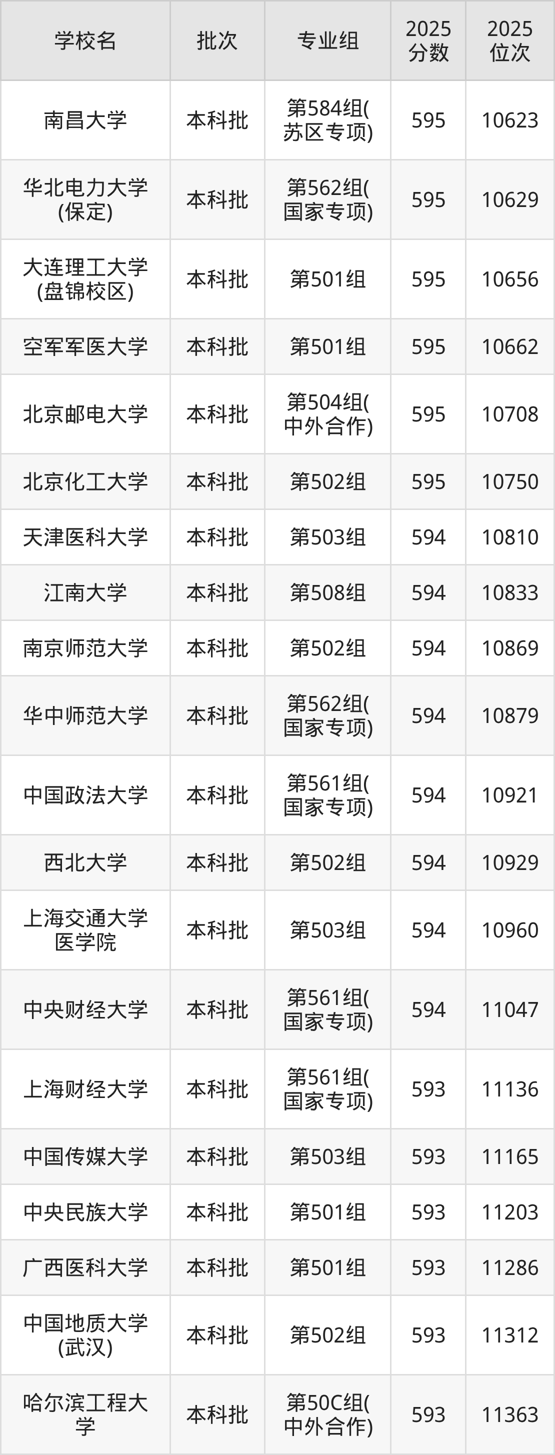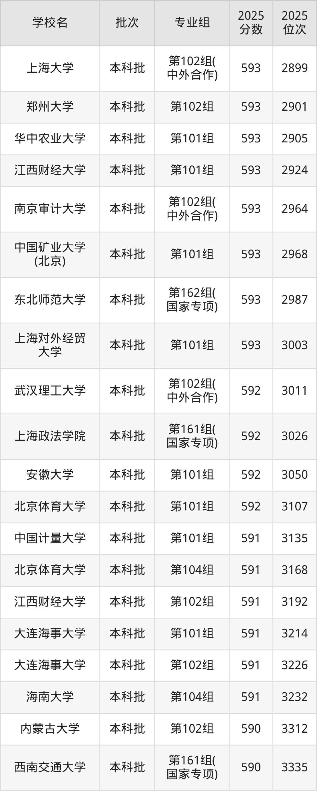2025年江西高考历史类593分(2888名~3009名)能上的大学有东北师范大学第162组(国家专项)、华北电力大学第161组(国家专项)、中国矿业大学(北京)第101组、上海大学第102组(中外合作)等。