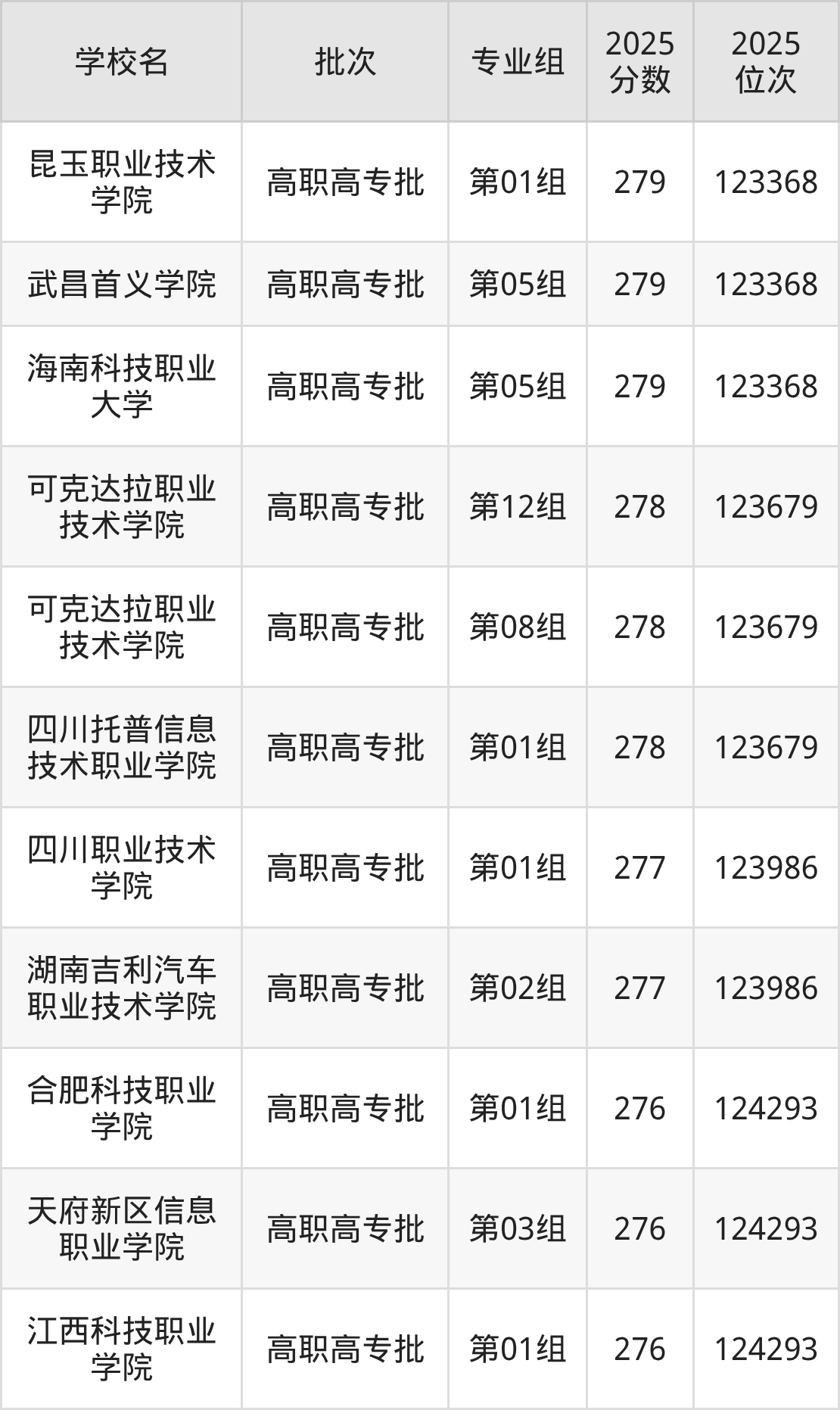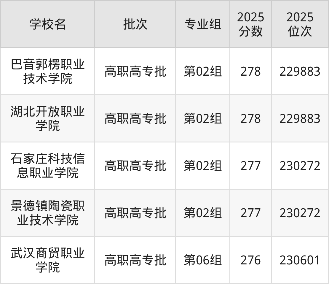 2025年湖北高考历史类277分(123680名~123986名)能上的大学有湖南吉利汽车职业技术学院第02组、四川职业技术学院第01组。