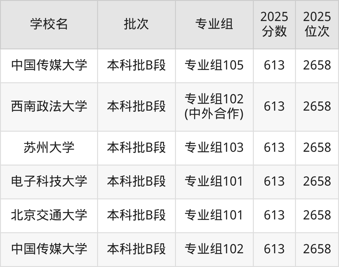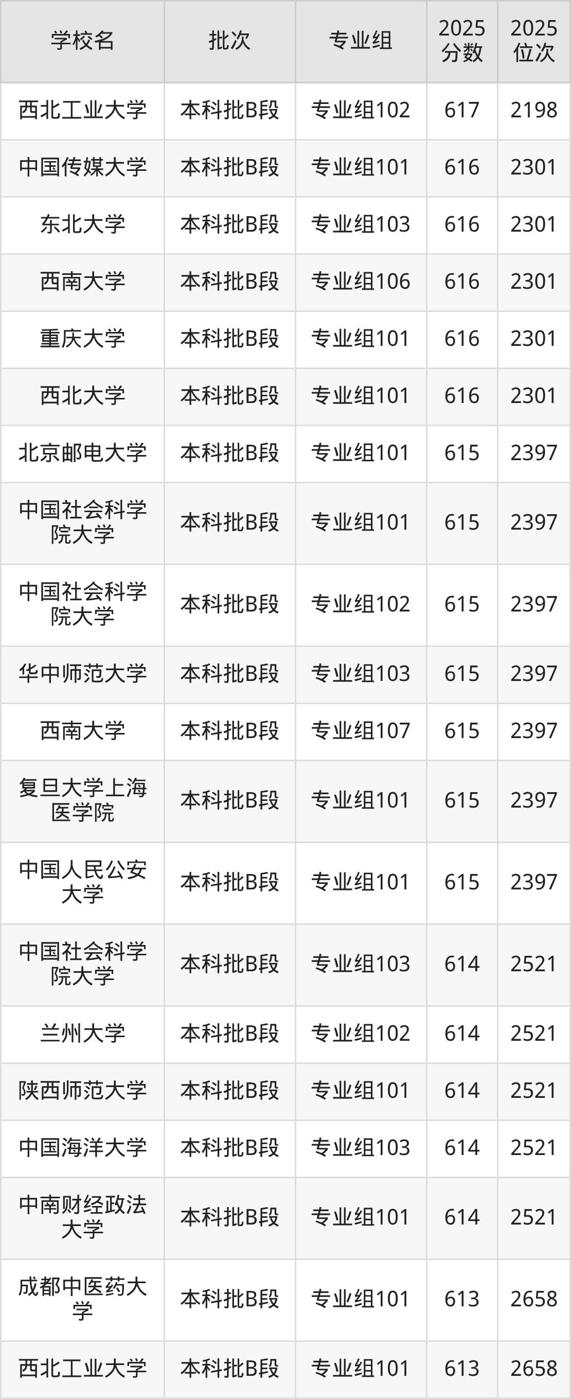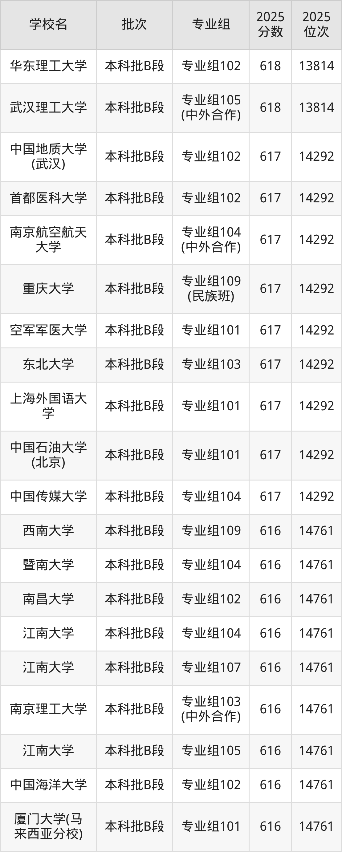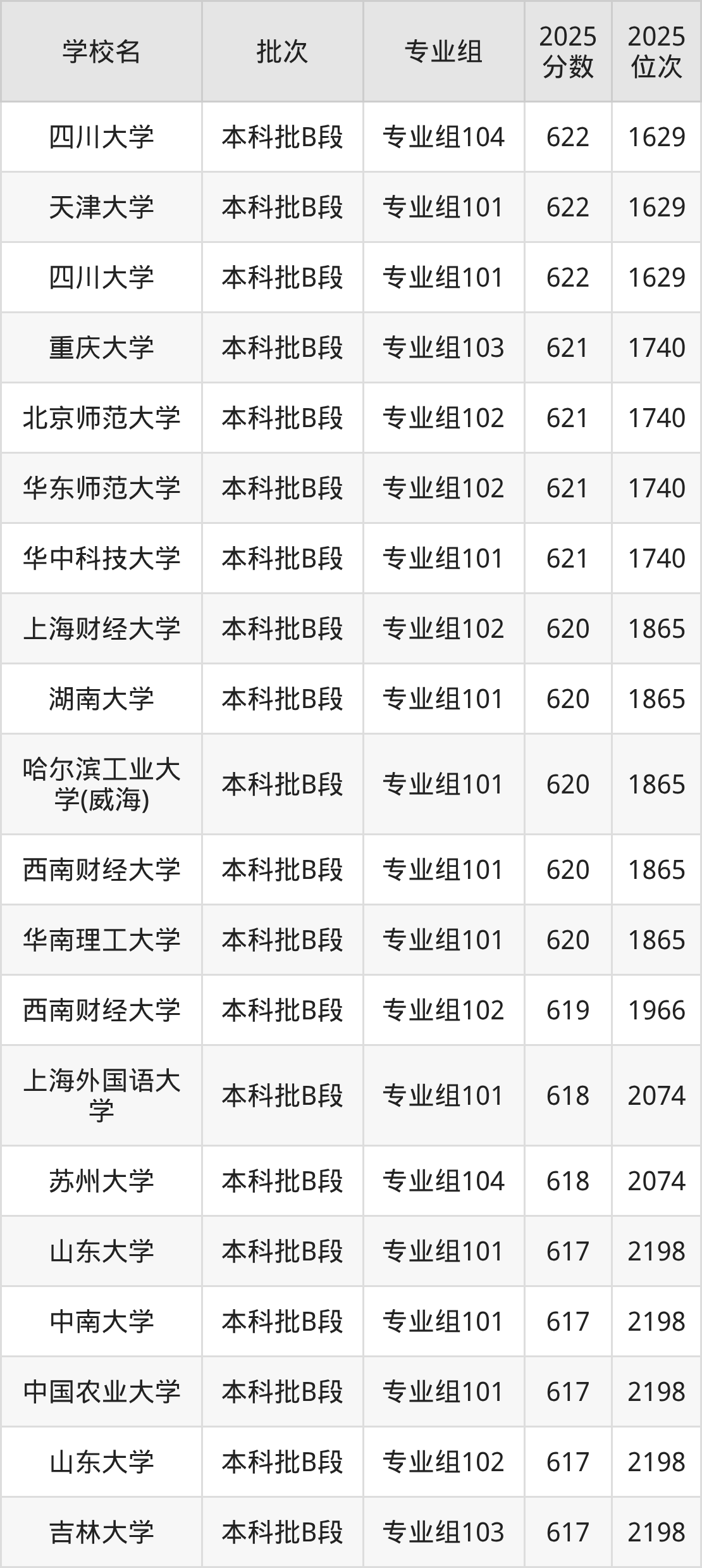 2025年四川高考历史类617分(2075名~2198名)能上的大学有中南大学专业组101、中国农业大学专业组101、山东大学专业组102、吉林大学专业组103等。