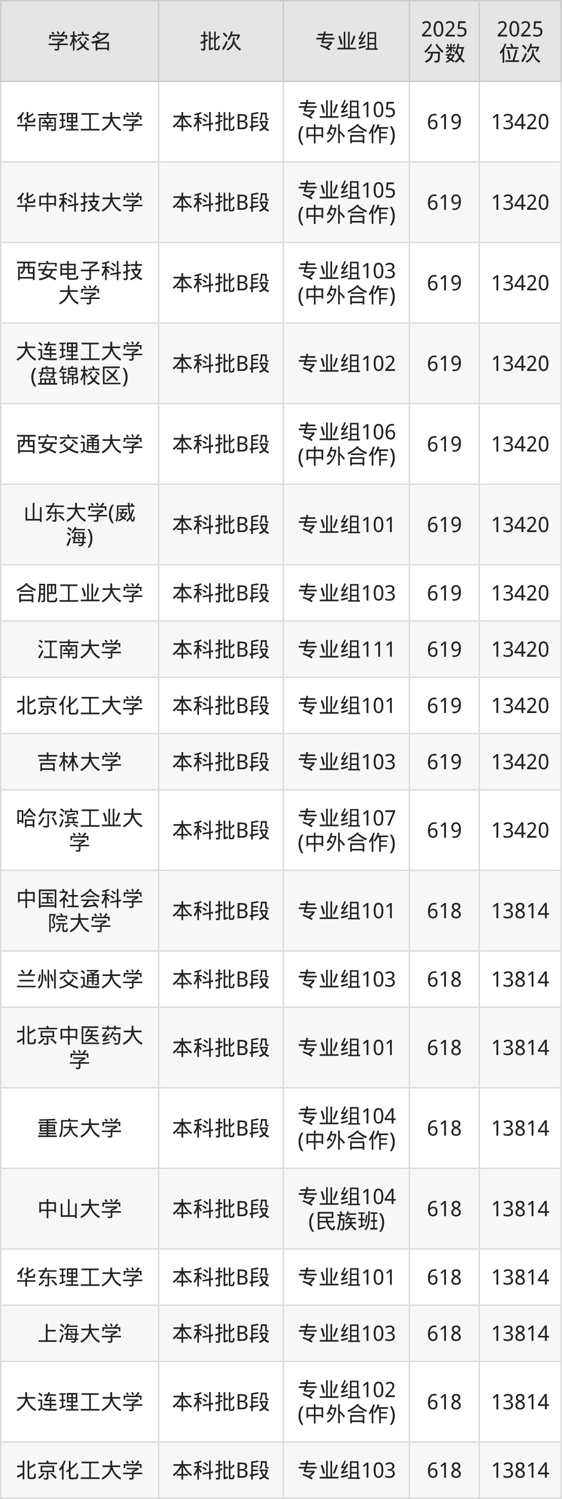 另外录取位次低于该区间(较稳妥)的有西南大学专业组109(14761名)、暨南大学专业组104(14761名)等;录取位次高于该区间(可冲)的有武汉理工大学专业组105(中外合作)(13814名)、兰州交通大学专业组103(13814名)等。