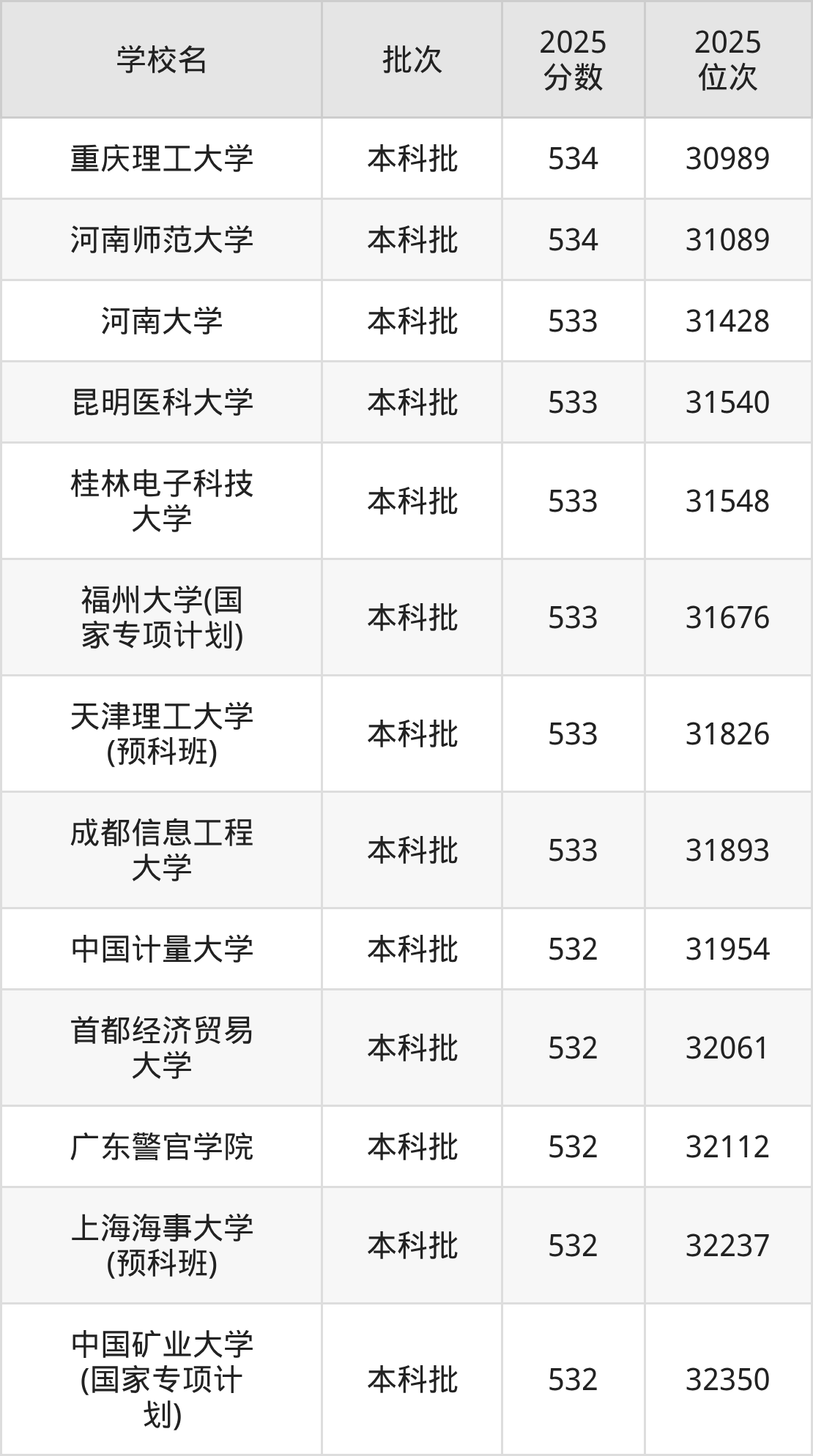 2025年贵州高考物理类533分(31339名~31894名)能上的大学有福州大学(国家专项计划)、天津理工大学(预科班)、昆明医科大学、成都信息工程大学等。