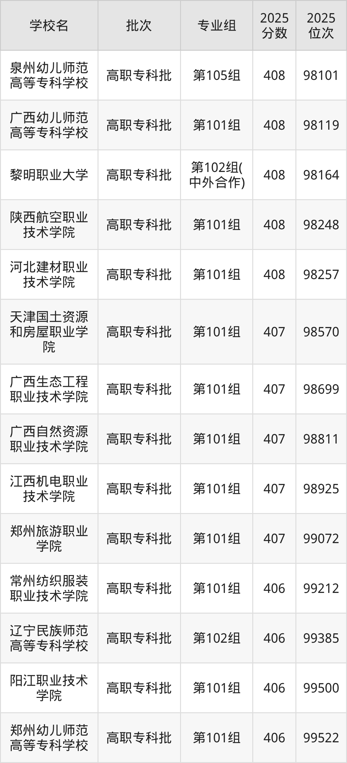 2025年江西高考历史类407分(98496名~99210名)能上的大学有天津国土资源和房屋职业学院第101组、郑州旅游职业学院第101组、广西自然资源职业技术学院第101组、广西生态工程职业技术学院第101组等。